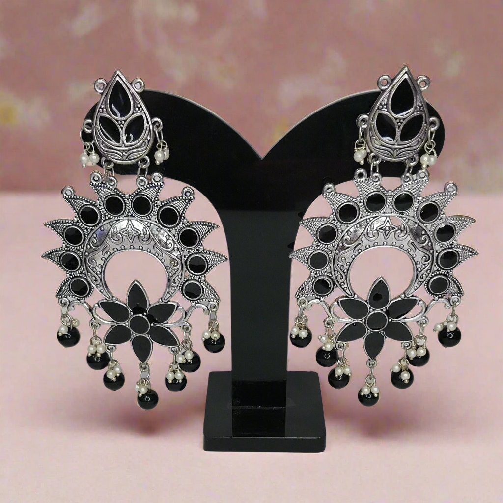 Gaon ka Saman Introducing our German Silver Oxidised Teardrop Tops with Hanging Chandbali and Black Flower with Pearl. These earrings feature a unique design with teardrop tops, elegant hanging chandbali, and a striking black flower adorned with a pearl. The combination creates a sophisticated look, ideal for Occasions like festivals, Functions, Parties, Wedding for Girls & Women, making a bold statement with style.