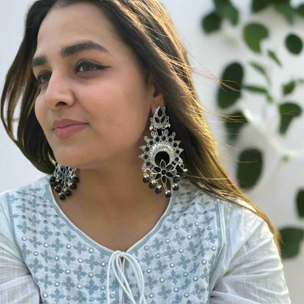 Stylish German Silver Oxidized Tops with teardrop design, hanging Chand Bali, and a black flower with pearl. Striking and sophisticated, perfect for festivals, Functions, Parties, Wedding.