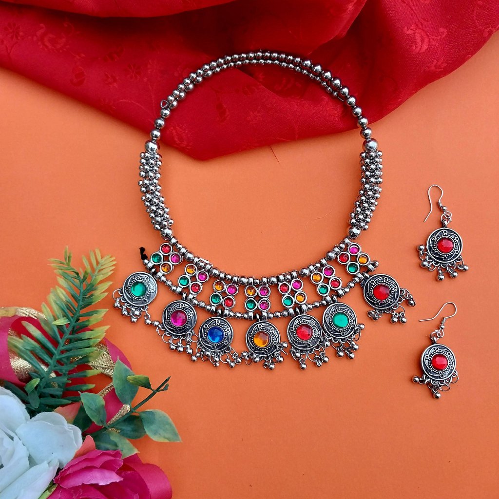 Kanthi necklace features an oxidised silver Kanthi style choker adorned with vibrant multi-coloured stones, combining traditional charm with contemporary elegance for a uniquely enchanting accessory.