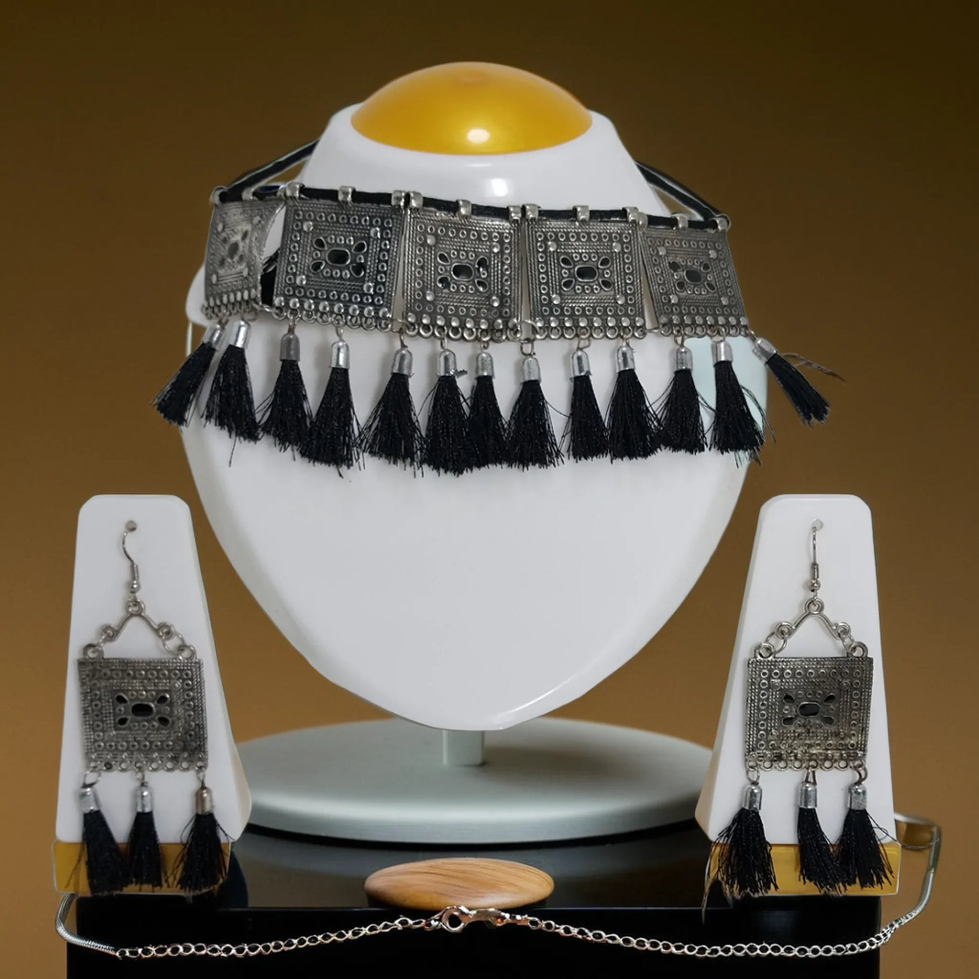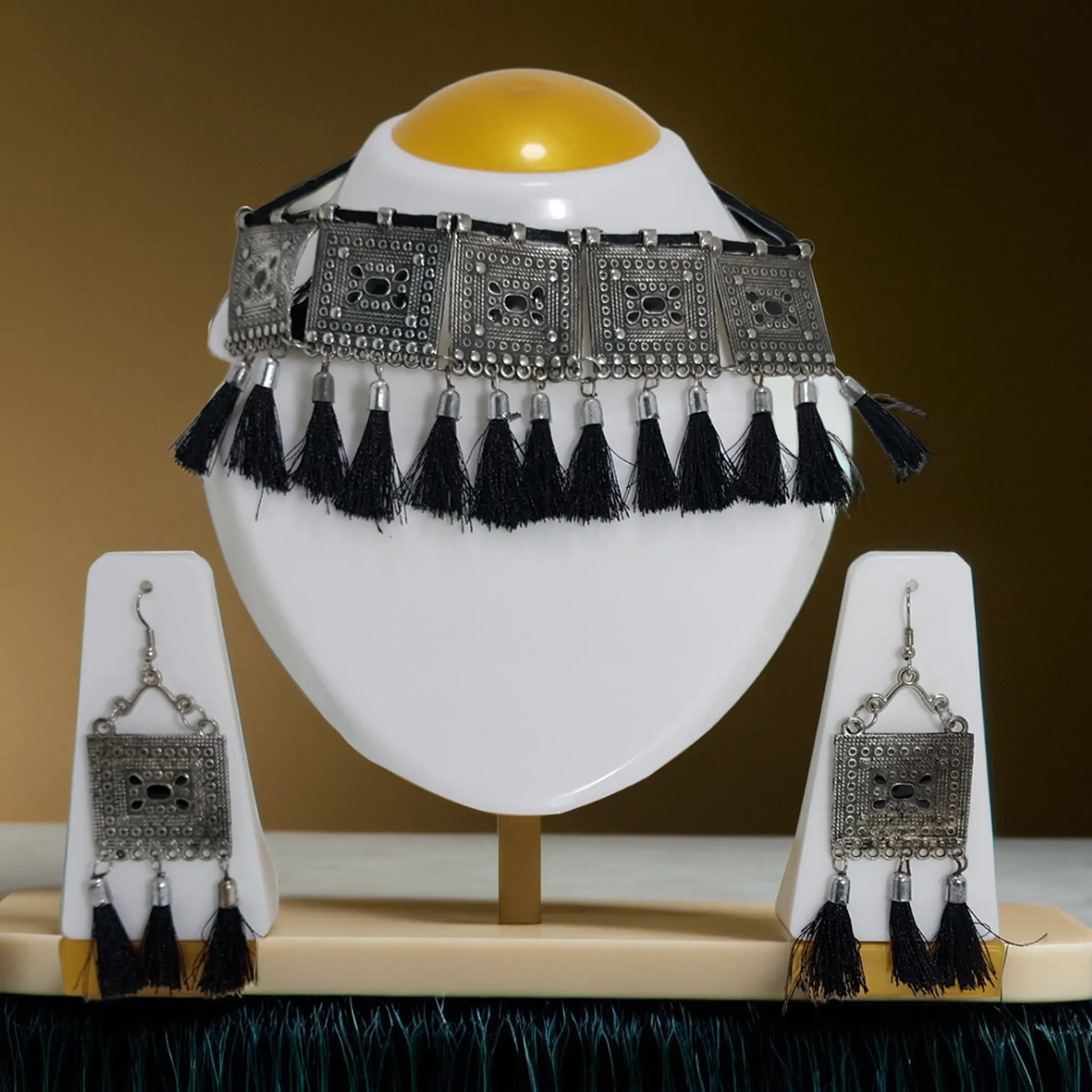 Gaon ka Saman Introducing an exquisite antique boho tassel choker, designed by skilled artisans. This statement piece features intricately carved metal plates connected with delicate chains, accented by soft tassels for a bold yet elegant appeal. Crafted from premium-quality alloy, it offers a lightweight and durable design, making it the perfect blend of tradition and style for any occasion.