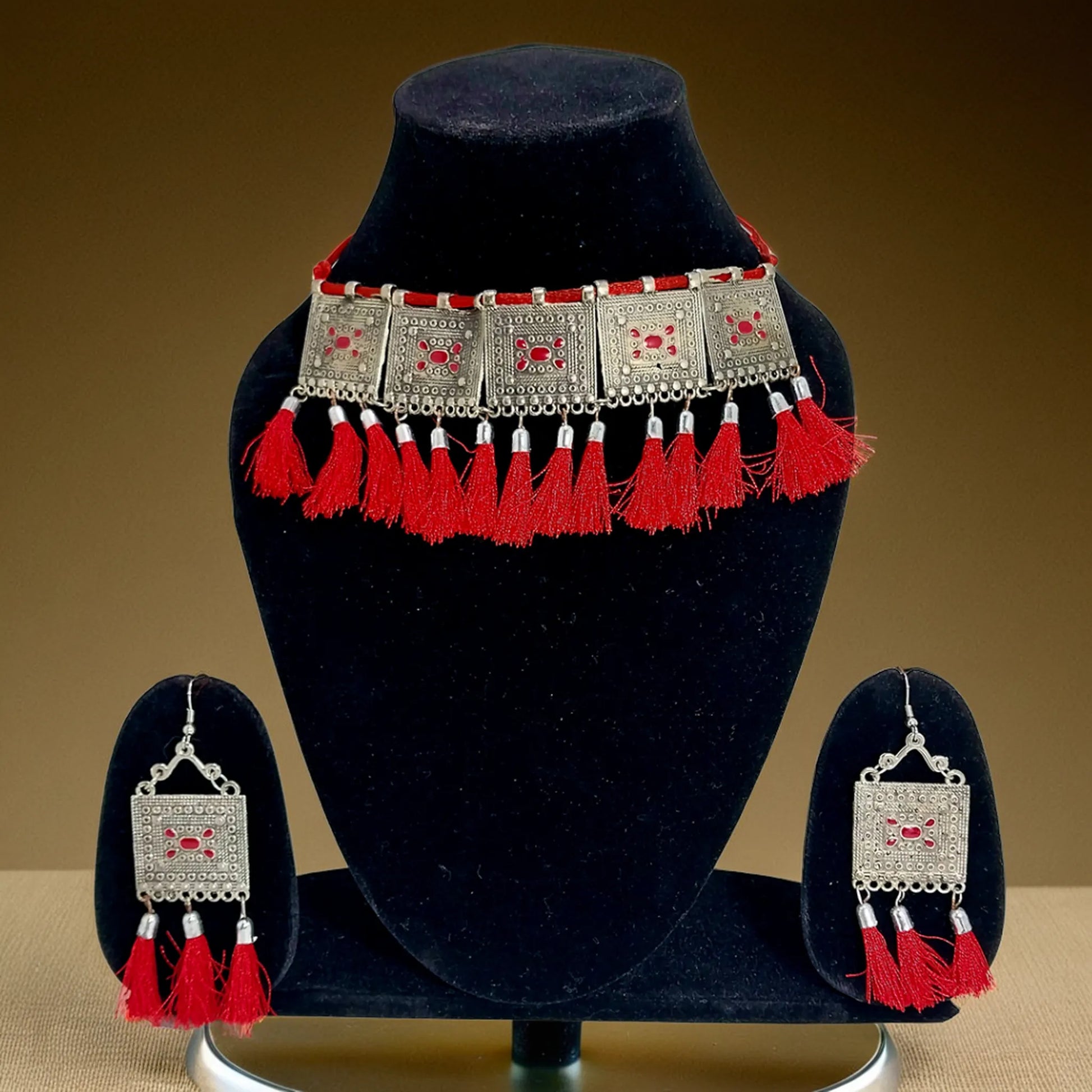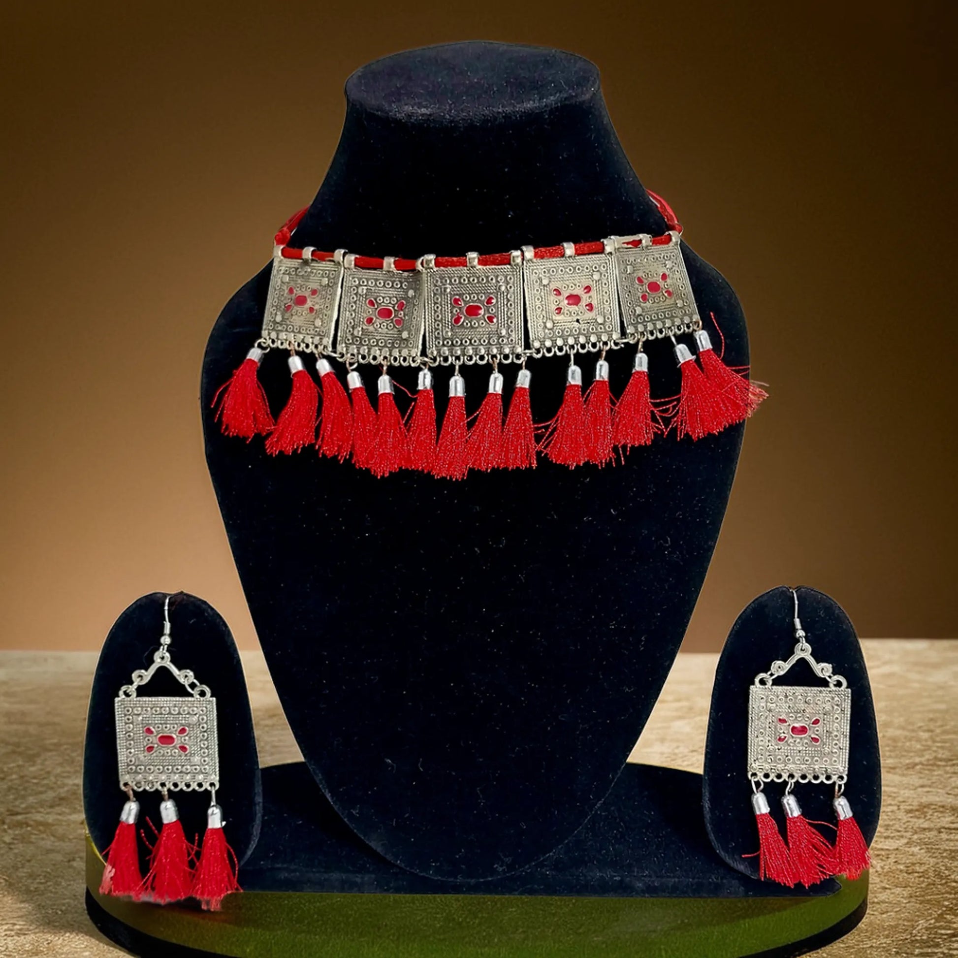 Gaon ka Saman Introducing a handcrafted tribal choker, a blend of tradition and elegance. Designed by skilled artisans, this statement piece showcases intricate metal carvings with square motifs, accented by delicate tassel embellishments. Made from high-quality oxidized metal alloy, this choker offers a unique ethnic charm, making it a must-have addition to your jewelry collection.