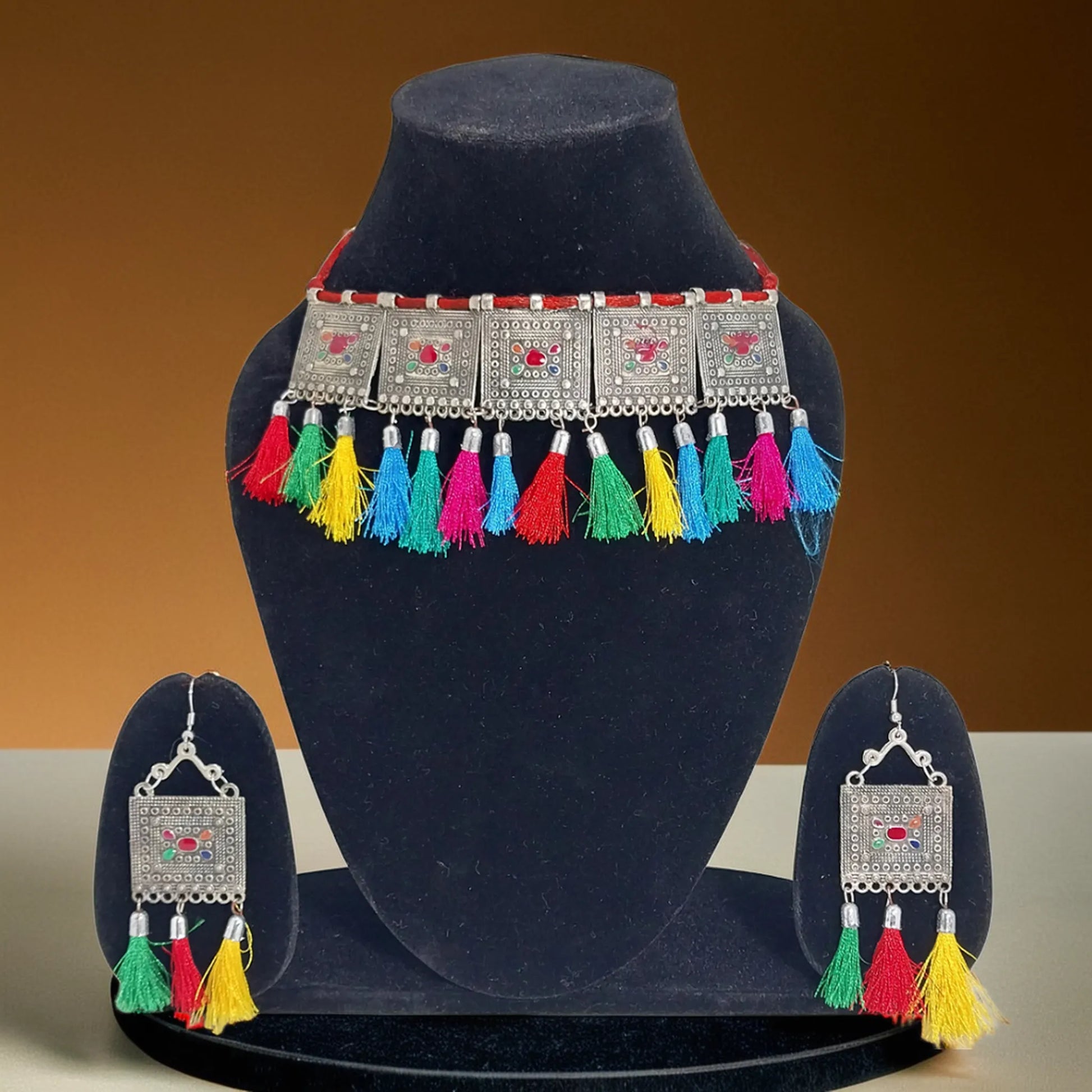 A beautifully handcrafted tribal choker featuring intricate metalwork and vibrant tassels, perfect for enhancing your ethnic or fusion look. Ideal for festivals, functions, parties, and weddings.