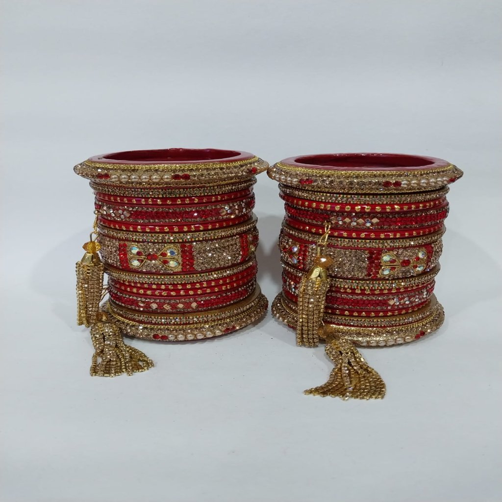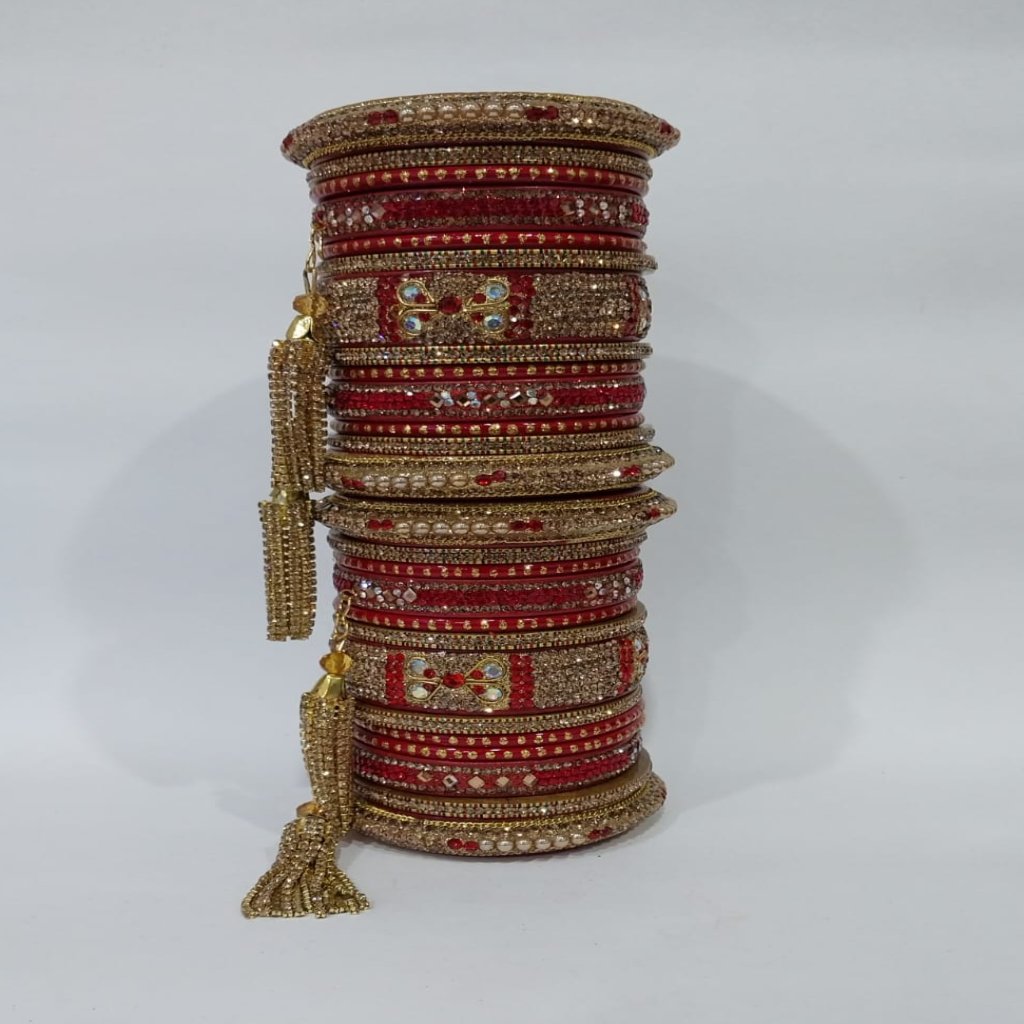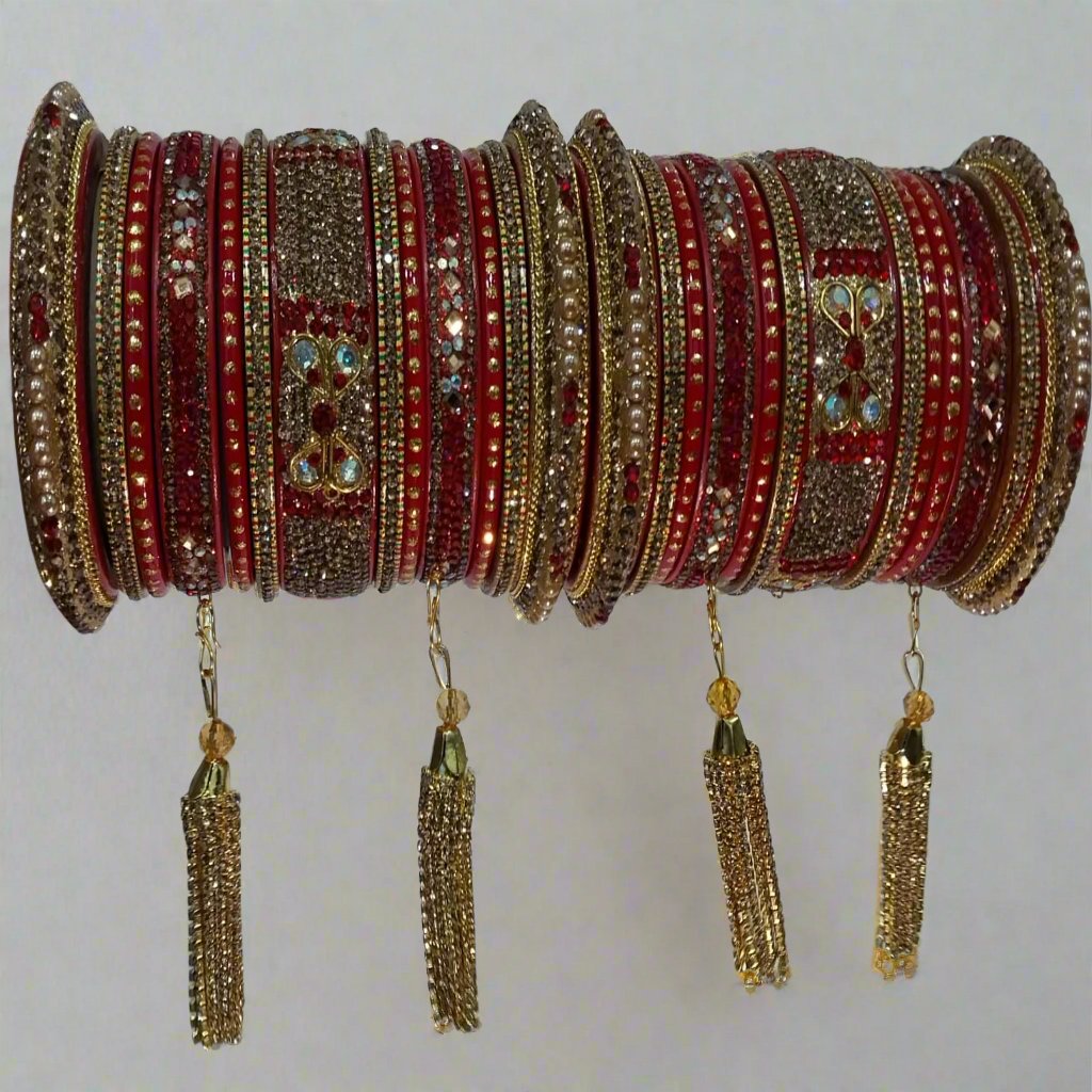 A bridal red lac chura set of 26 bangles, embellished with gold and red stones. Features a teardrop stone in the central bangle and dangling chains, perfect for weddings and special occasions.