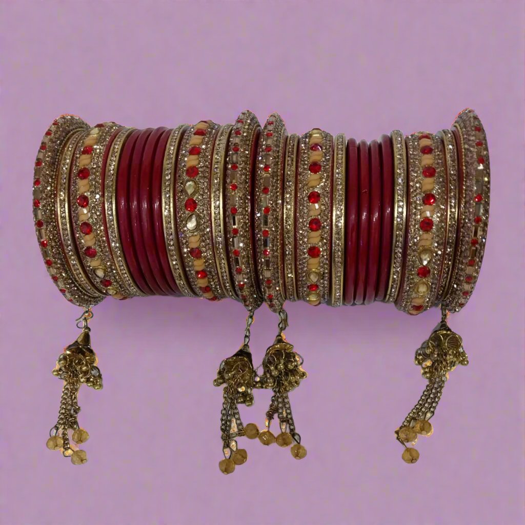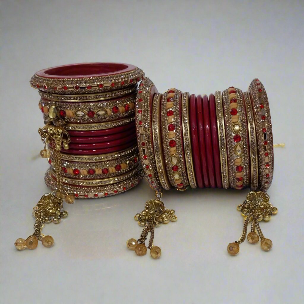 Bridal red lac chura set of 24 bangles, adorned with red and yellow stones and featuring a floral teardrop stone arrangement. Includes a central plain bangle with dangling chain structure, perfect for weddings and special occasions.