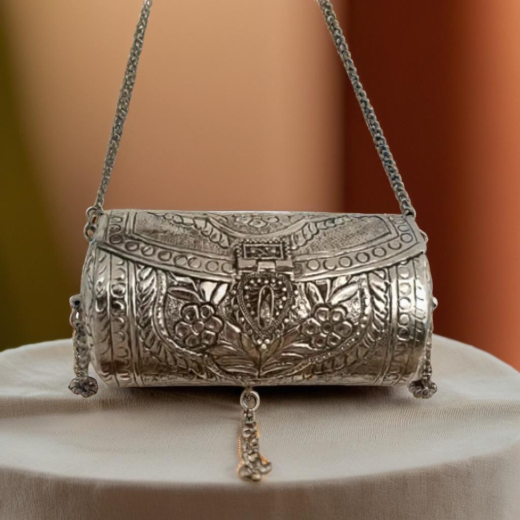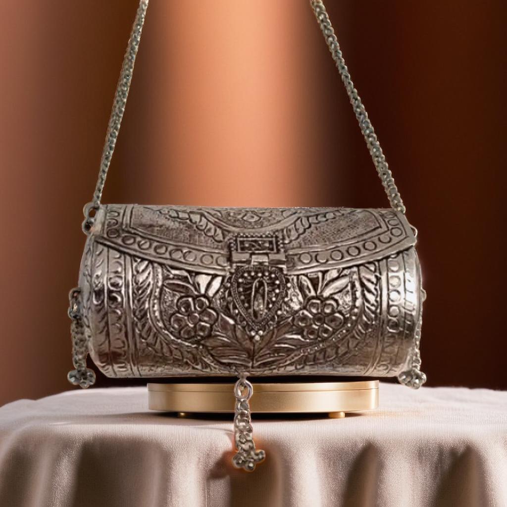 A stunning cylindrical silver-tone bag featuring detailed engravings and an ornate clasp design. Perfect for festivals, functions, parties, and weddings—ideal for girls and women.