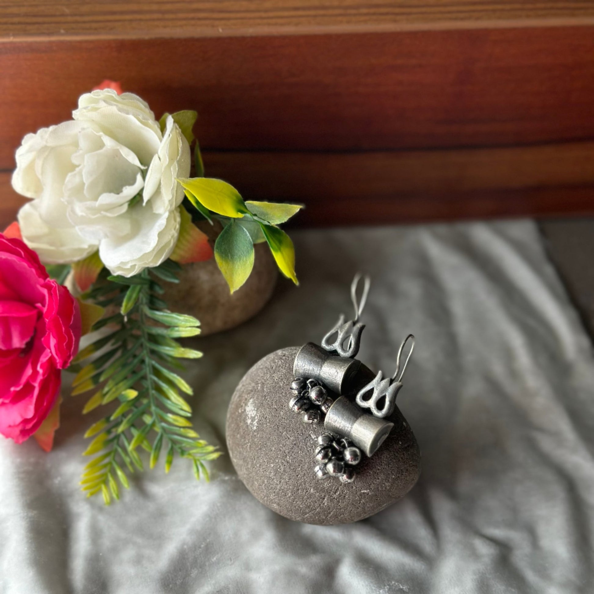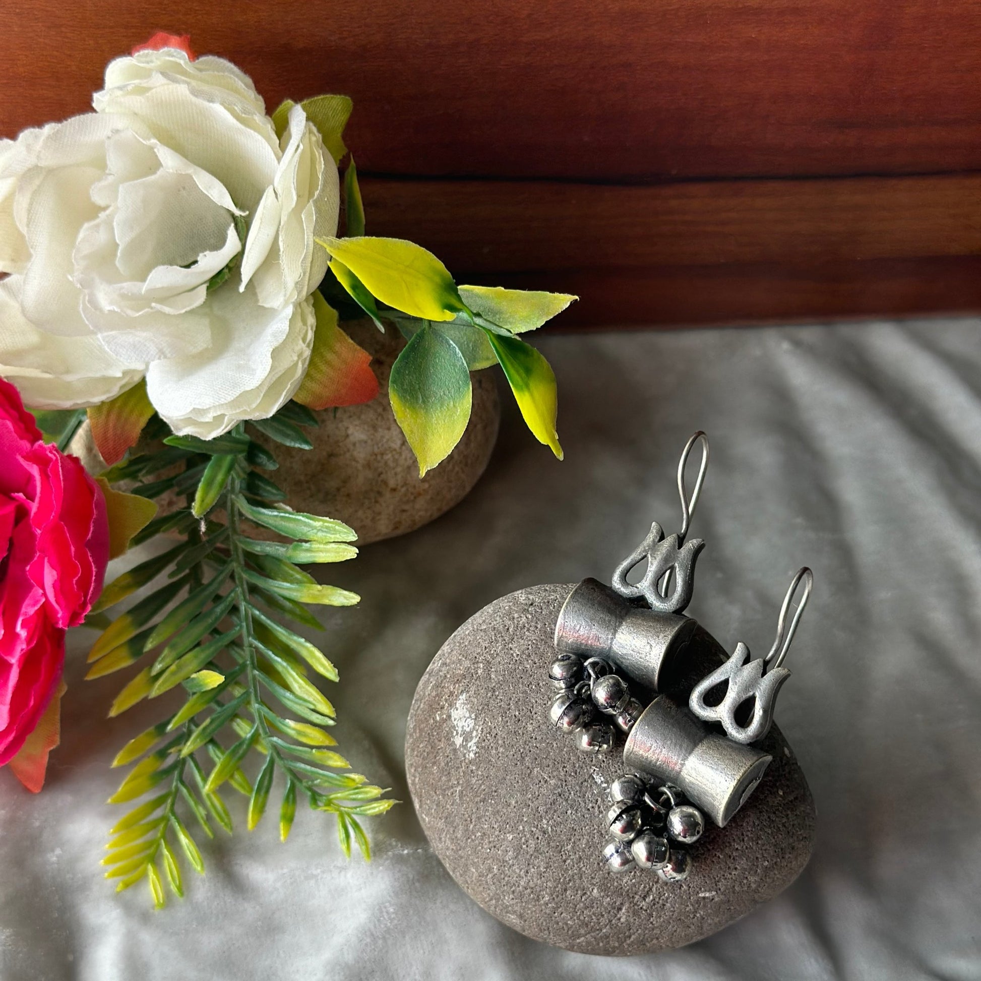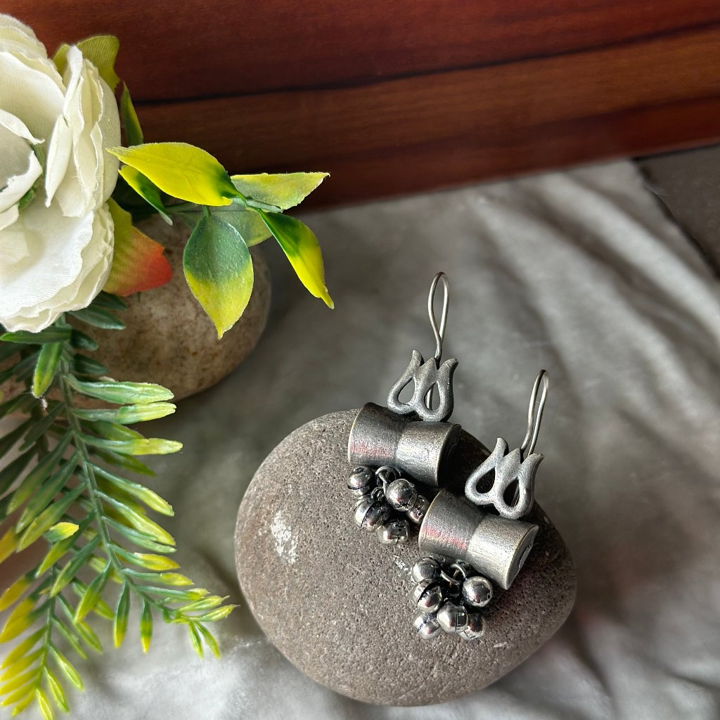 Gaon ka Saman Introducing enchanting damru and trident silver oxidized earrings, crafted with intricate detailing by skilled artisans. These earrings feature beautiful hanging silver bells that create a delightful sound, making them perfect for festive occasions. Their traditional design adds a unique flair to any outfit, making them a must-have accessory.