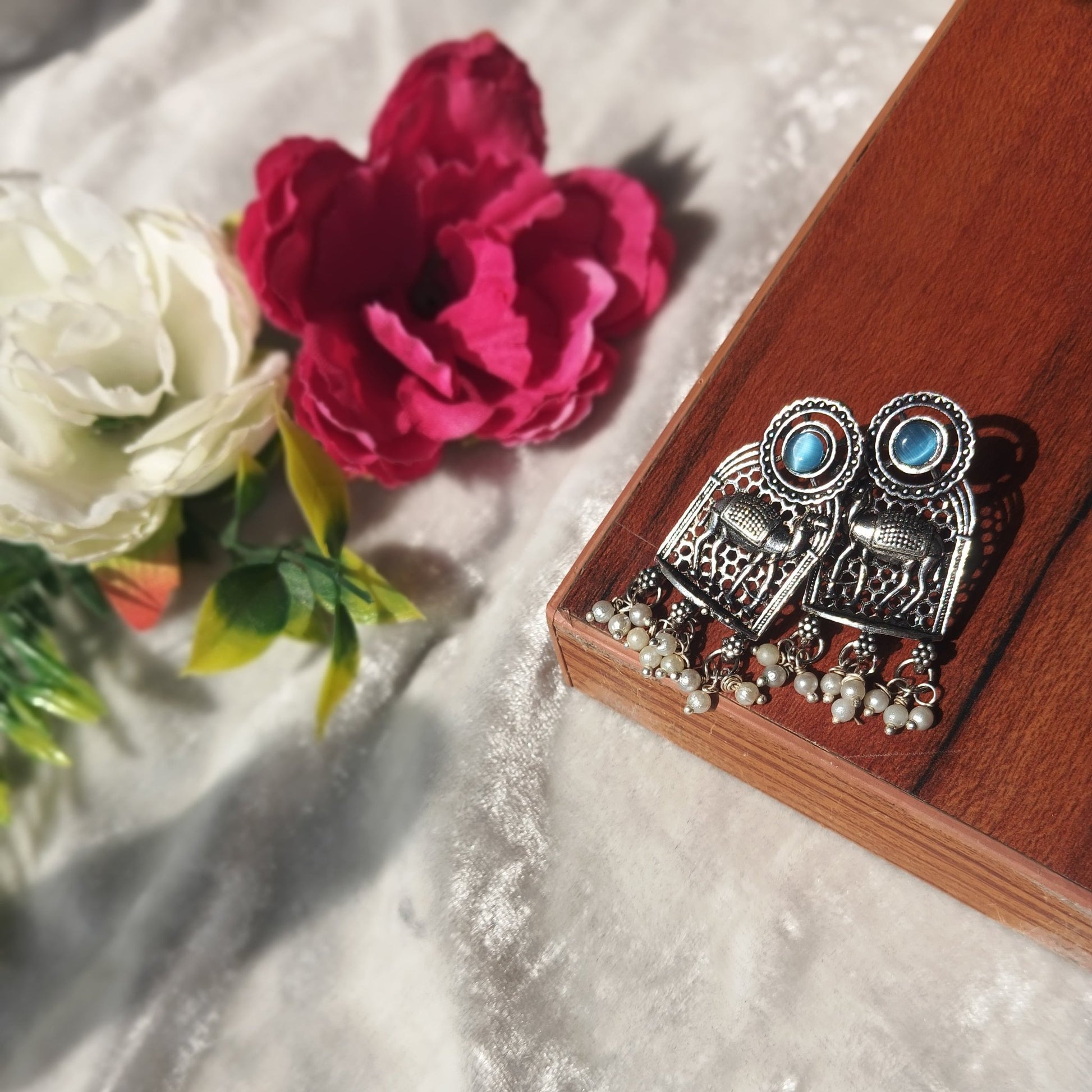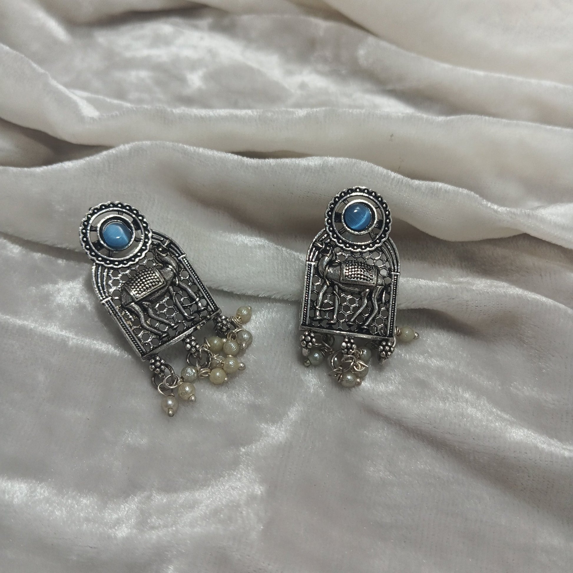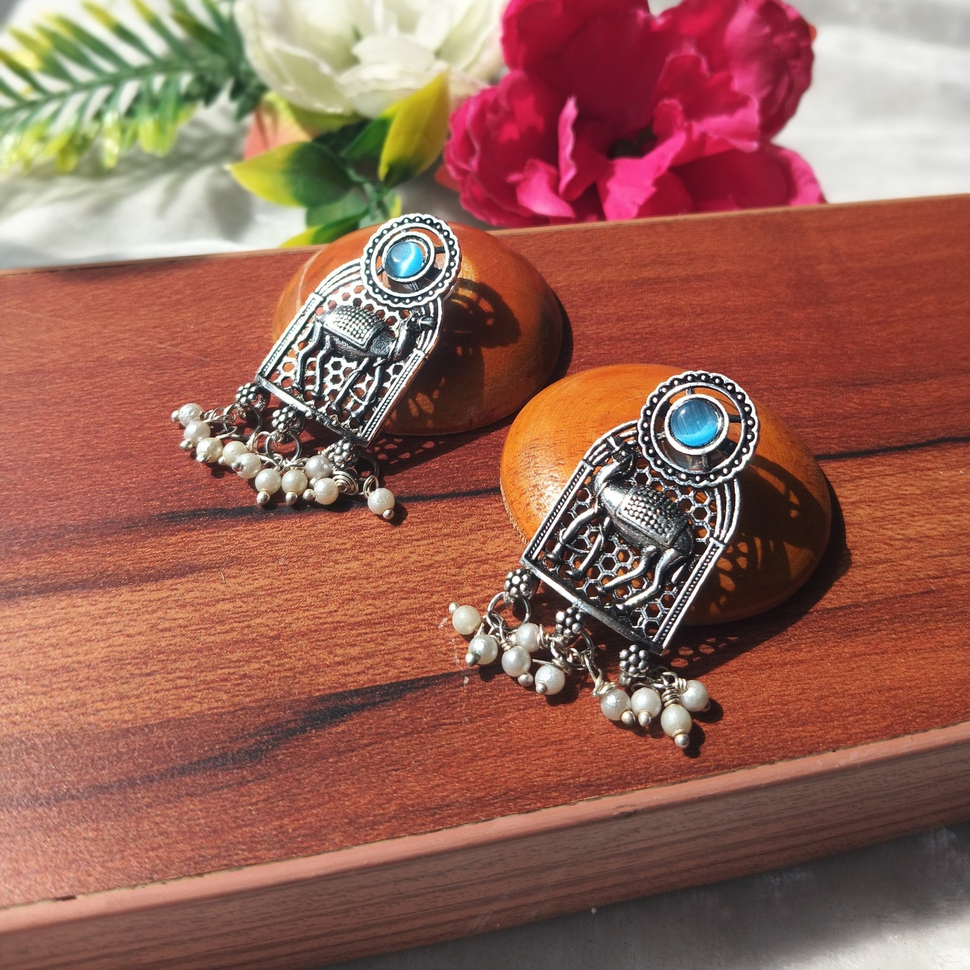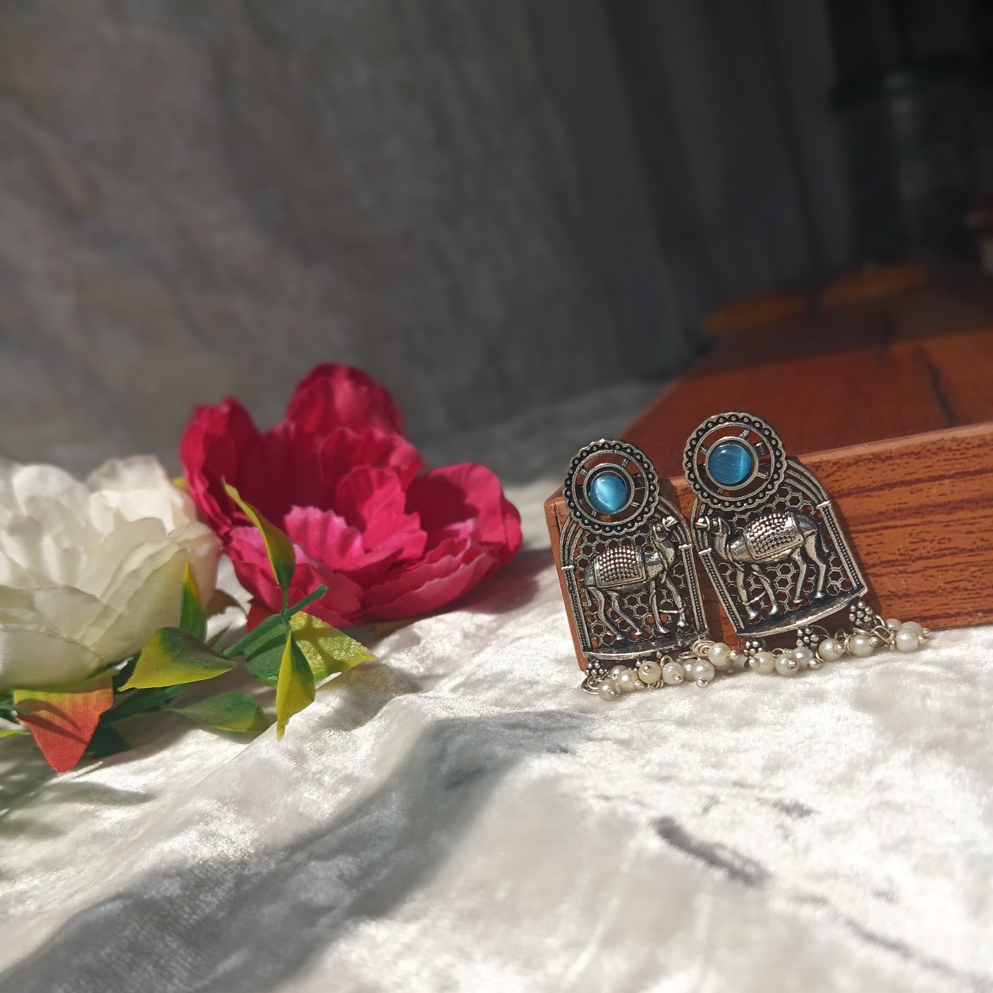 Gaon ka Saman Introducing charming dome-shaped camel silver oxidized earrings, intricately designed with a central stone and adorned with dangling small white pearls. Available in blue and green, these earrings reflect traditional craftsmanship with a modern twist, making them a perfect accessory for various occasions and adding a unique touch to your style.