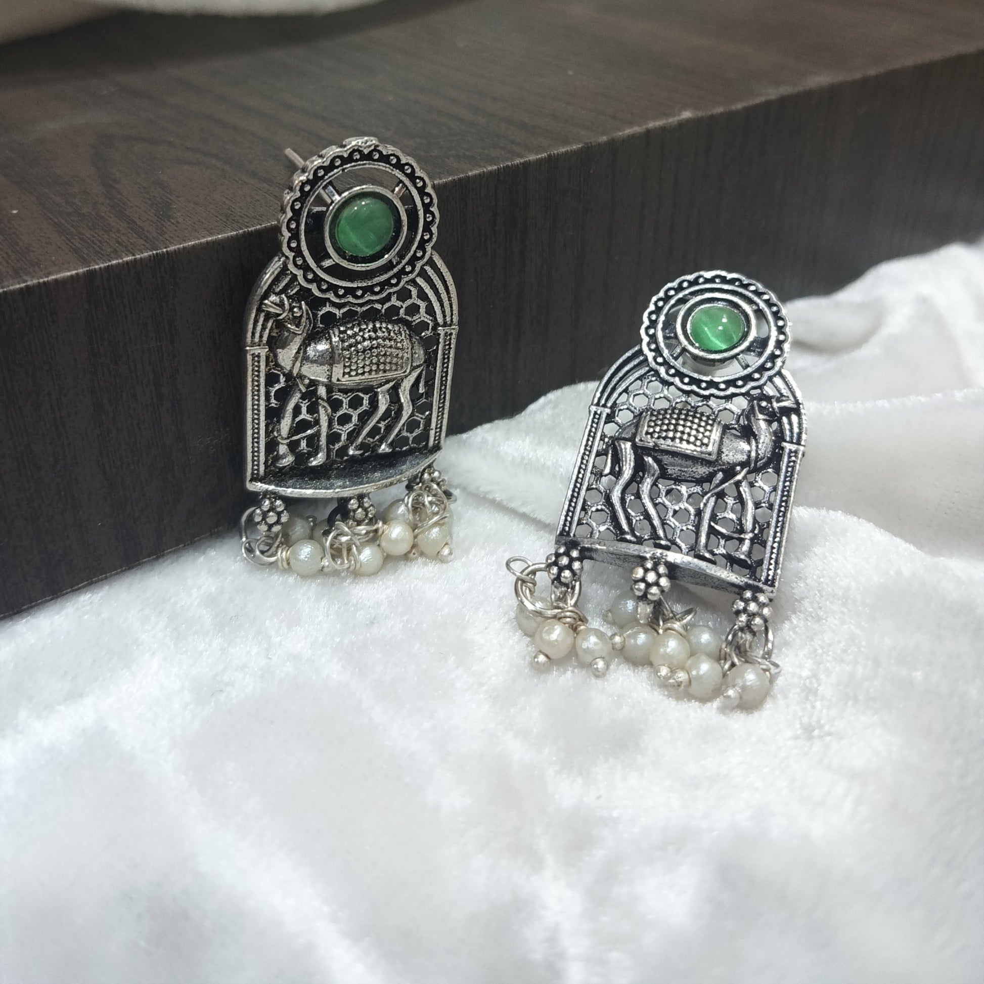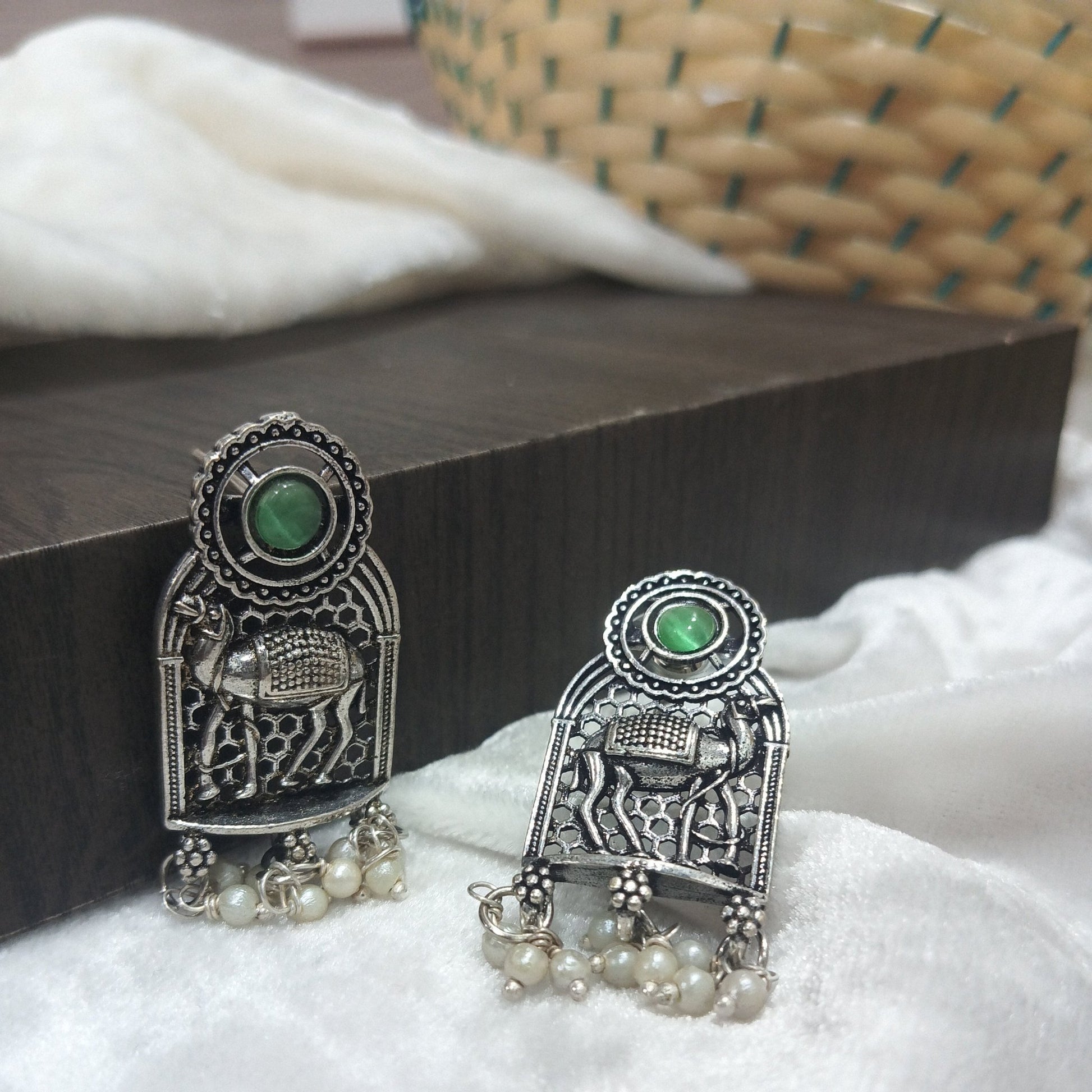 Introducing unique dome-shaped camel silver oxidized earrings featuring a central stone and dangling small white pearls, available in beautiful colors for every occasion at ease. Occasions like festivals, functions, parties, weddings perfect for girls & women.