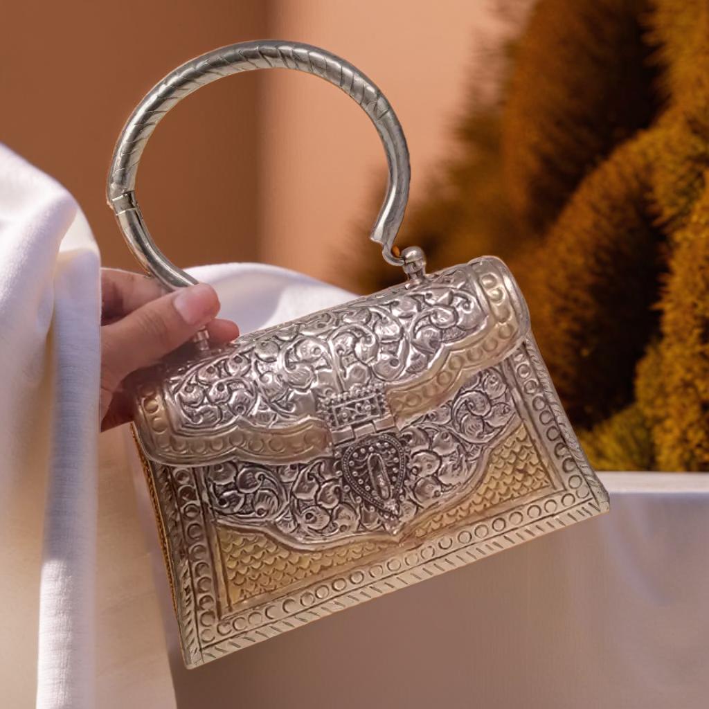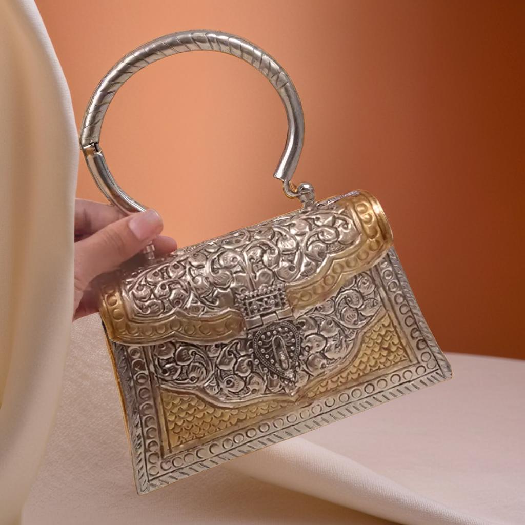 An elegant dual-tone silver and gold handcrafted bag featuring intricate engravings and a sturdy handle. Perfect for festivals, functions, parties, and weddings—ideal for girls and women.