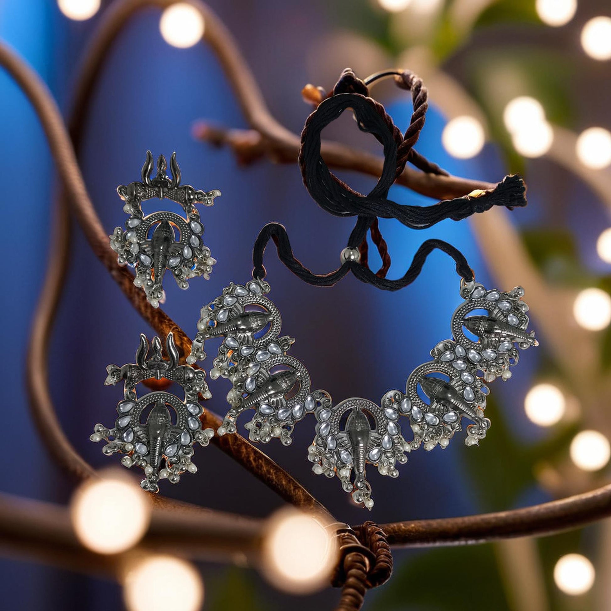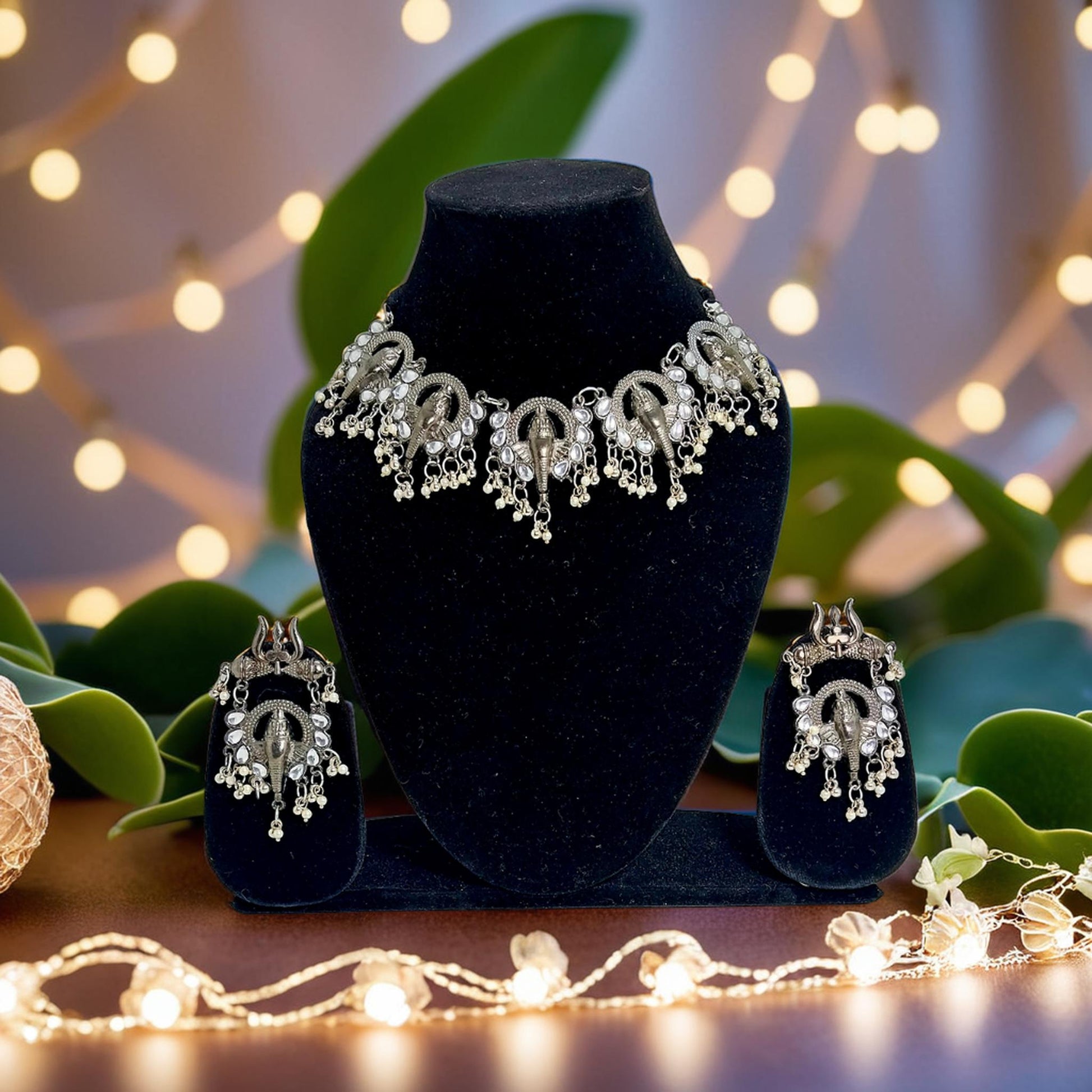 Elegant German silver oxidised choker set with a detailed Ganpati design. Includes matching earrings and features an adjustable thread for a comfortable and customizable fit.