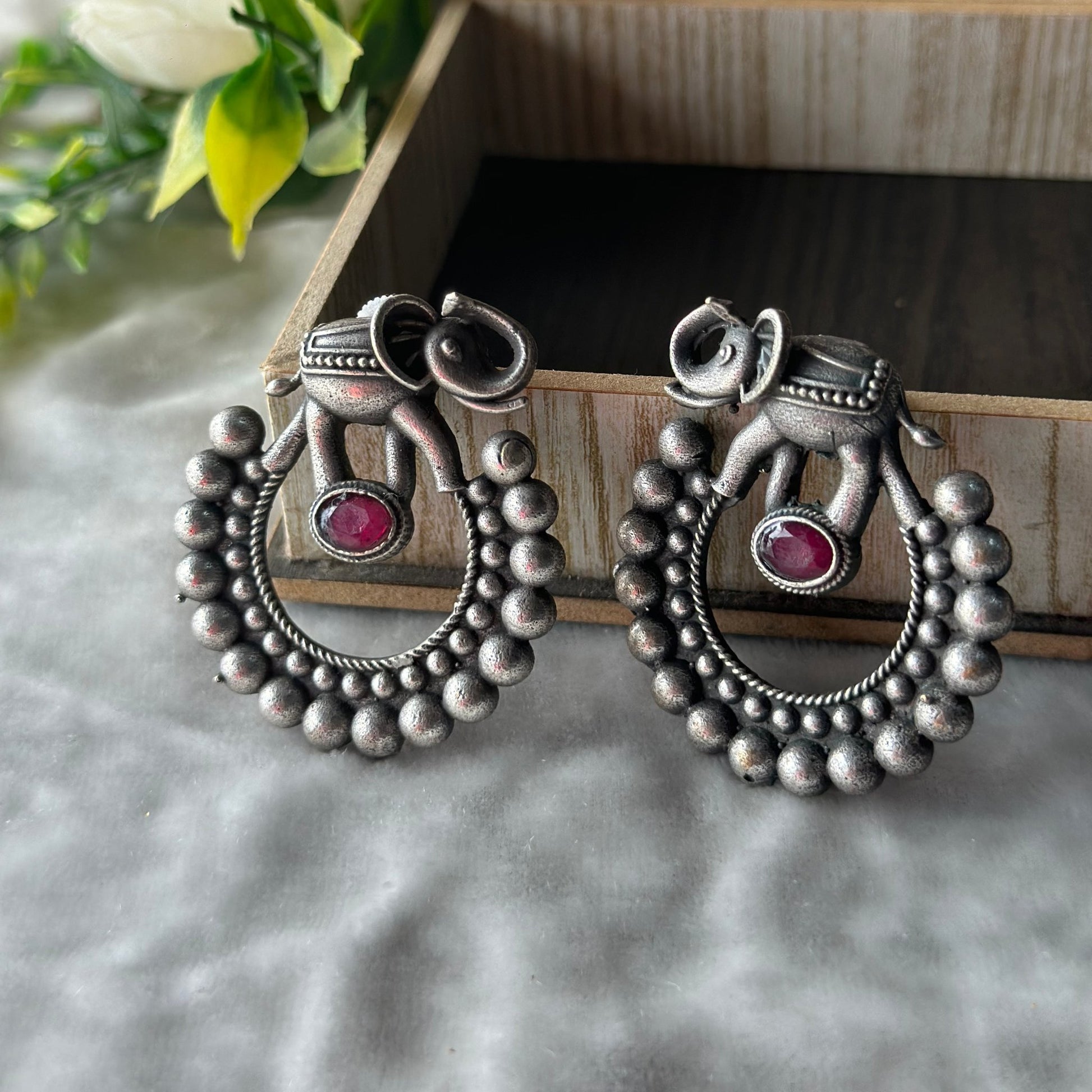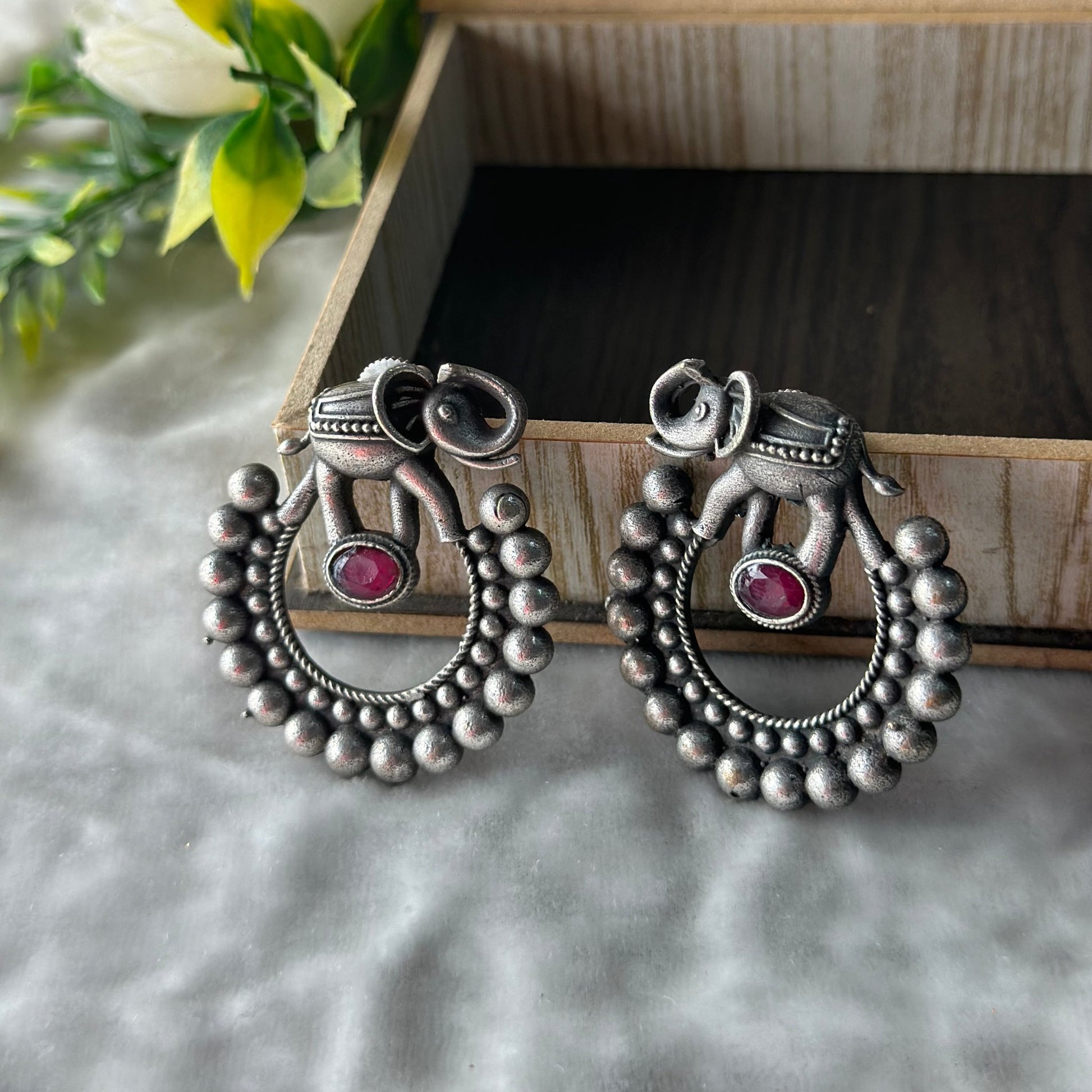 Introducing charming elephant silver oxidized earrings featuring mesmerizing large circular dots, designed with a central pink stone, perfect for adding a unique touch at ease. Occasions like festivals, functions, parties, weddings perfect for girls & women.