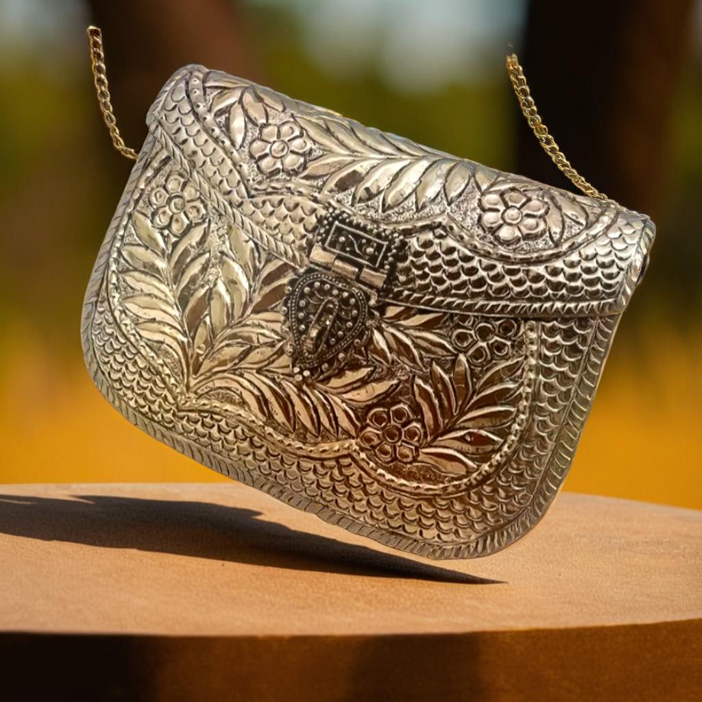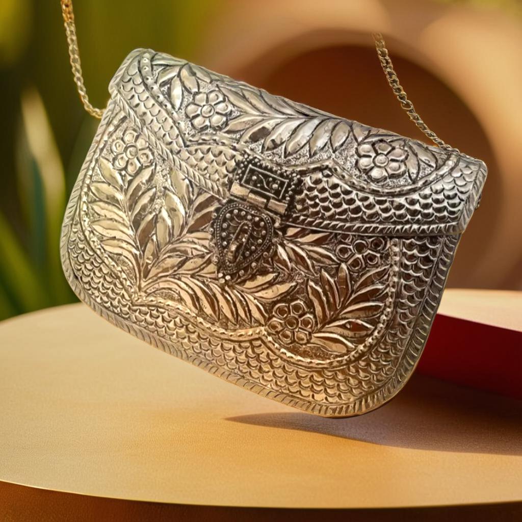 A beautifully handcrafted silver-tone bag with intricate floral patterns and an ornate clasp. Perfect for festivals, functions, parties, and weddings—ideal for girls and women.