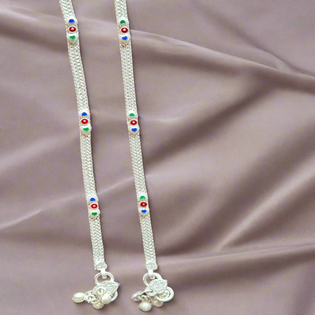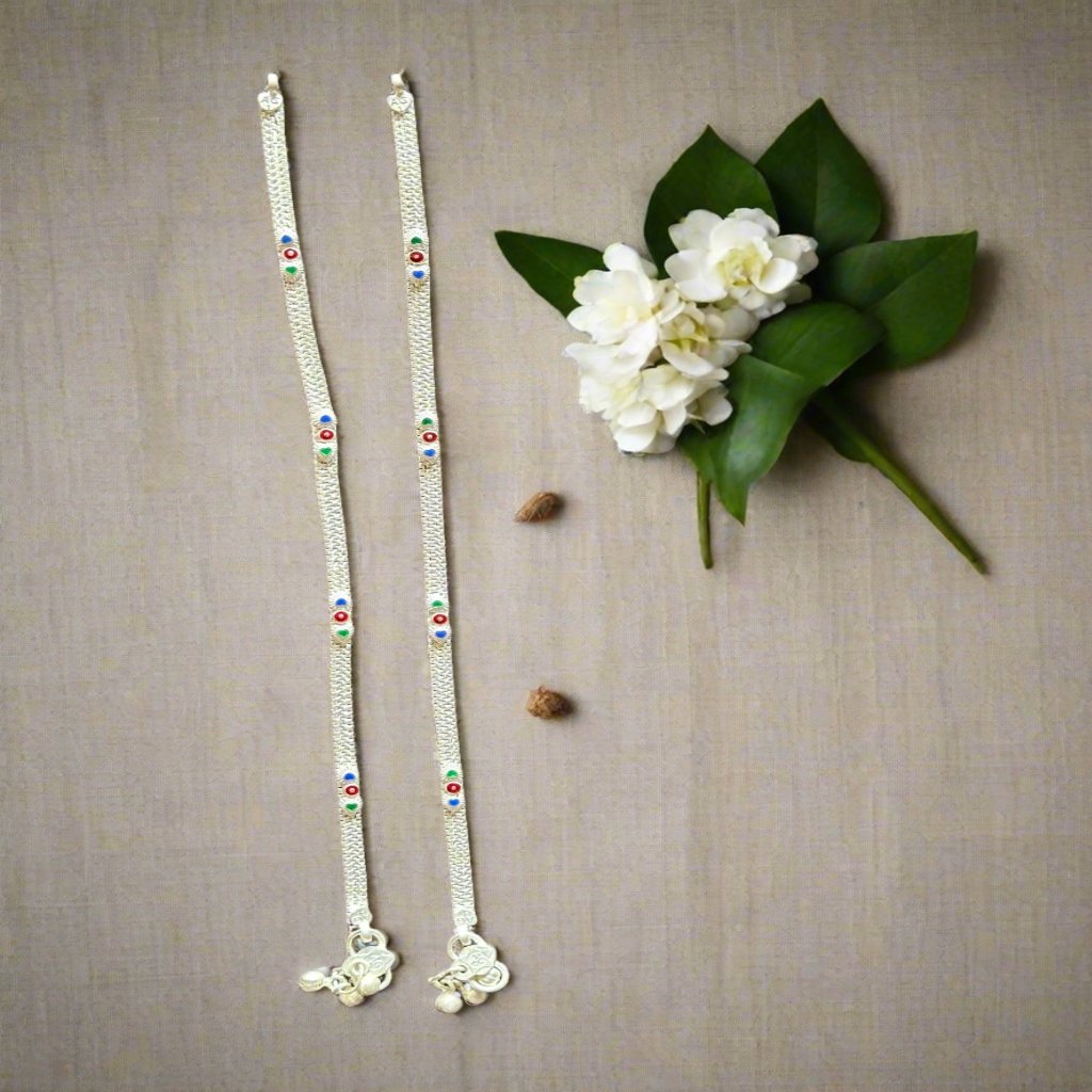 Elegant tri-line silver chain anklets with small flowers, green-blue dual heart designs connected by a red circle. Ideal for festivals, functions, parties, weddings. Perfect for girls & women.