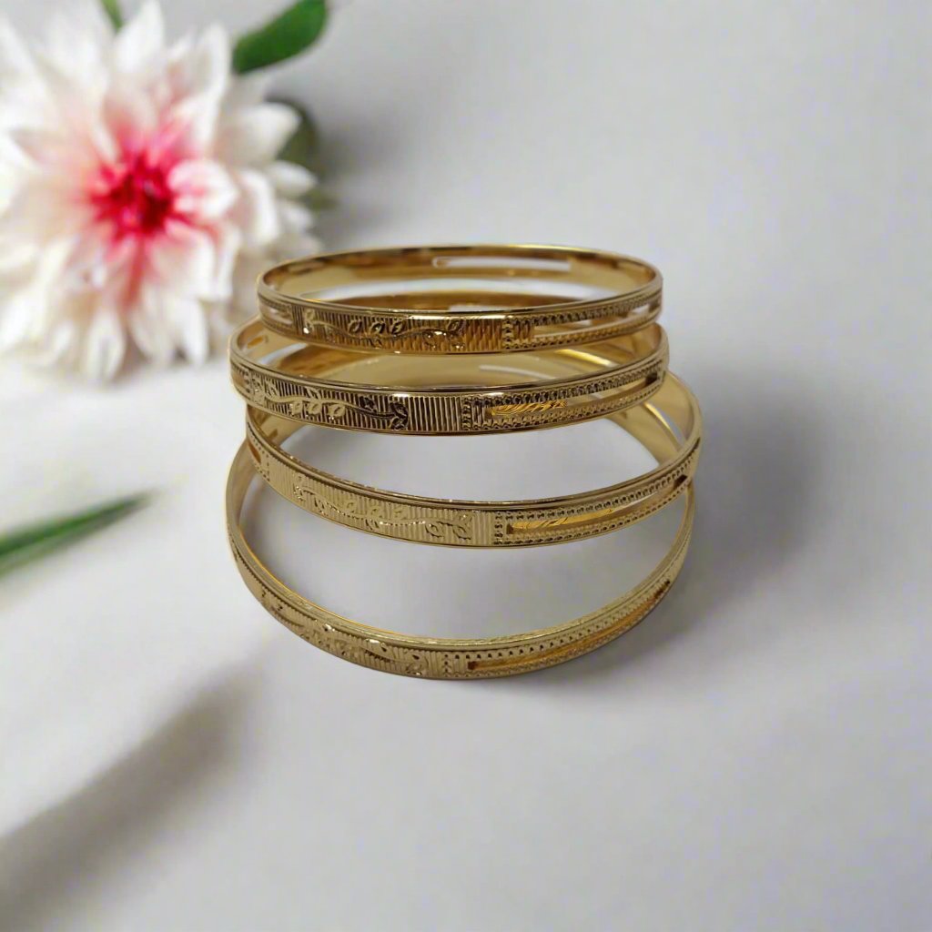 Gaon Ka Saman introducing an exquisite set of 4 bangles by skilled artisans. Crafted from Gold Platted floral wine Brass Bangles and gold-plated, these bangles feature intricate cutouts and designs, offering a contemporary yet traditional vibe.