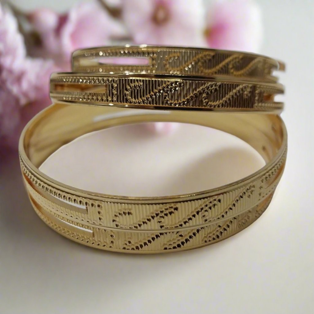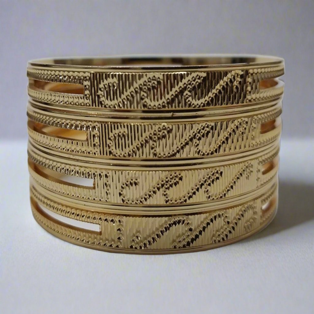Gaon Ka Saman introducing an exquisite set of 4 bangles by skilled artisans. Crafted from brass and gold-plated, these bangles feature intricate cutouts and designs, offering a contemporary yet traditional as timeless beauty.