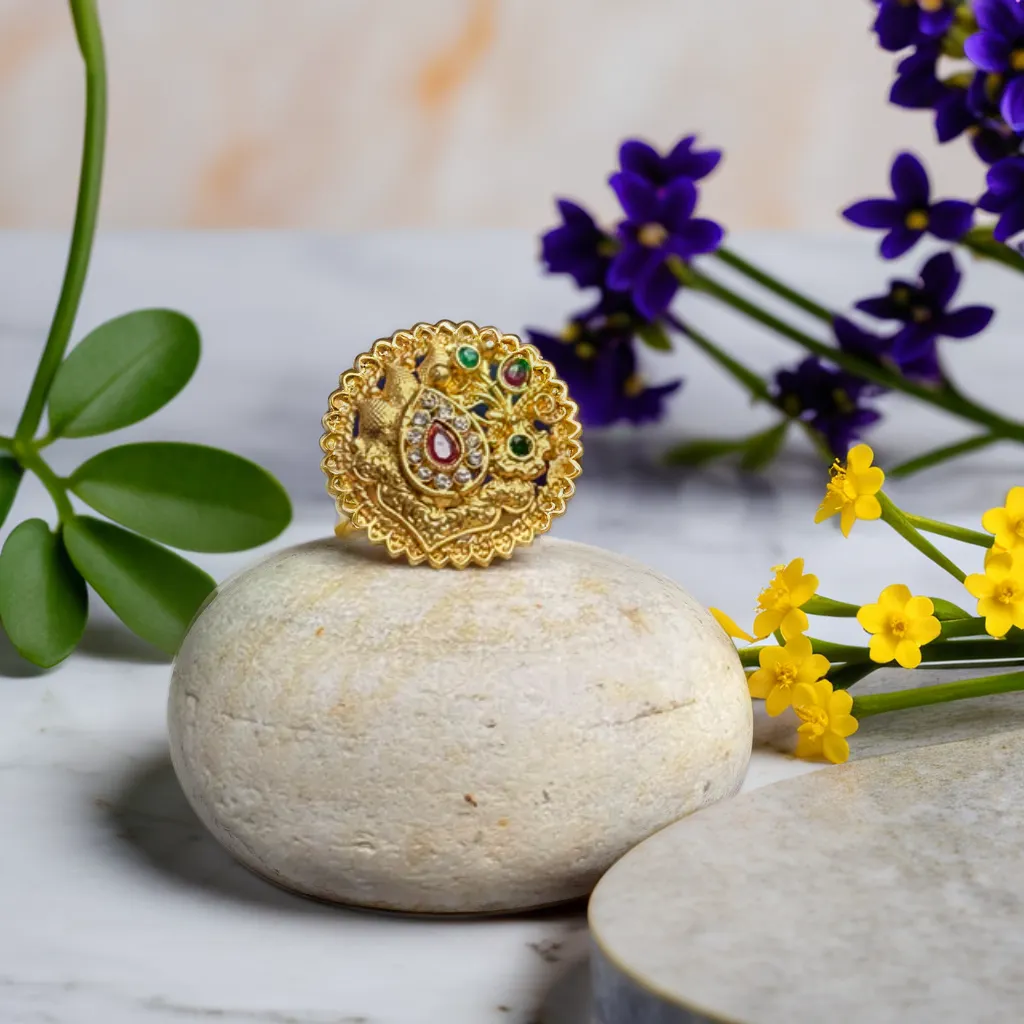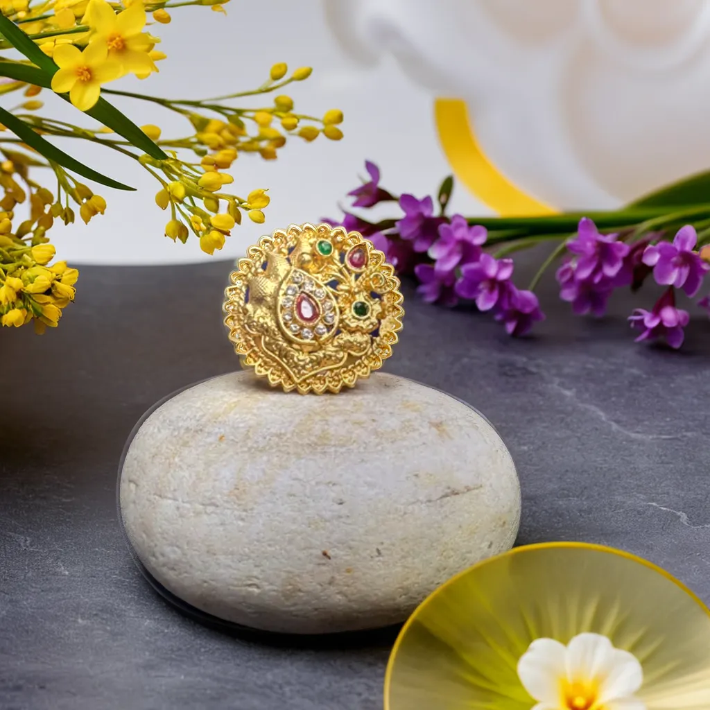 Brass rings with unique round designs, detailed structure, and multicolor rhinestones. Occasions like festivals, functions, parties, weddings perfect for girls & women.