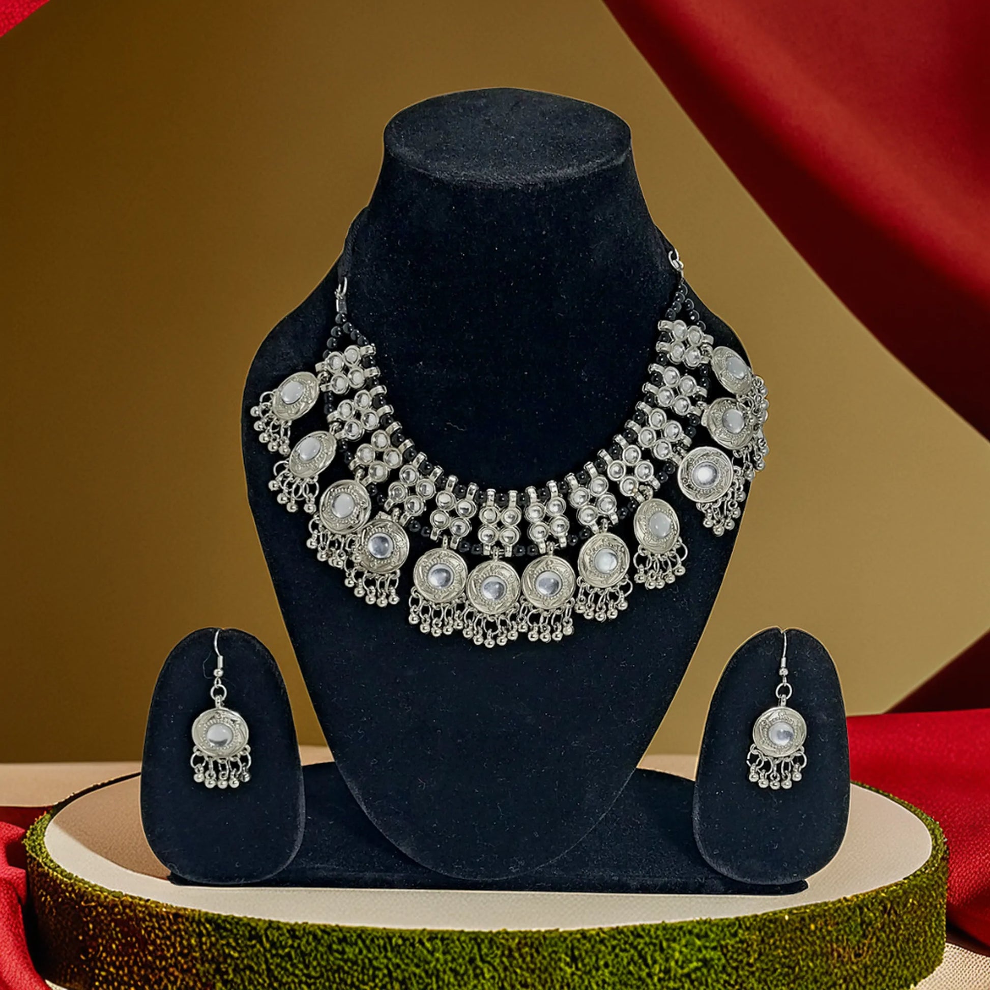 Gaon ka Saman Introducing an exquisite choker, crafted by skilled artisans to reflect timeless beauty. This handcrafted masterpiece showcases intricate Kundan detailing with beautifully arranged pearls, enhancing its regal appeal. Made from high-quality metal alloy with oxidized silver polish, this traditional jewelry set is designed to complement your ethnic and festive wardrobe with elegance and grace.
