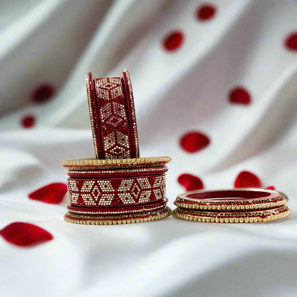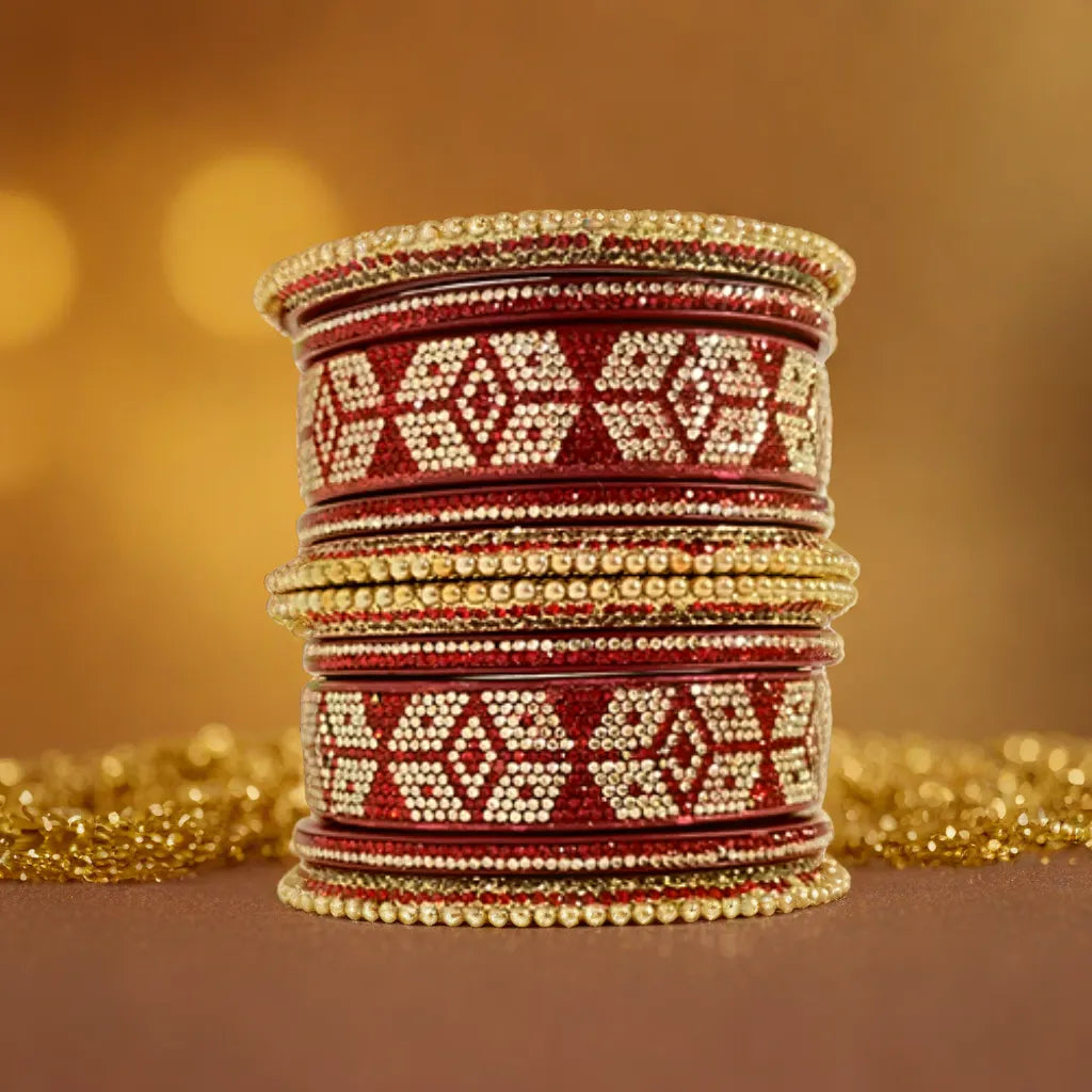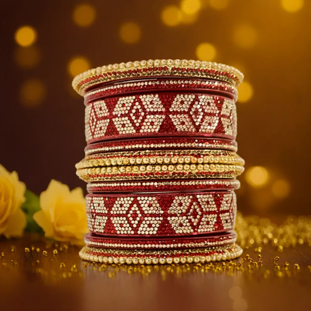 Experience elegance with these handcrafted bridal red lakh bangles adorned with golden pearls, rhombus designs, and studded stones. Perfect for festivals, functions, parties, and weddings—ideal for Girls & Women.