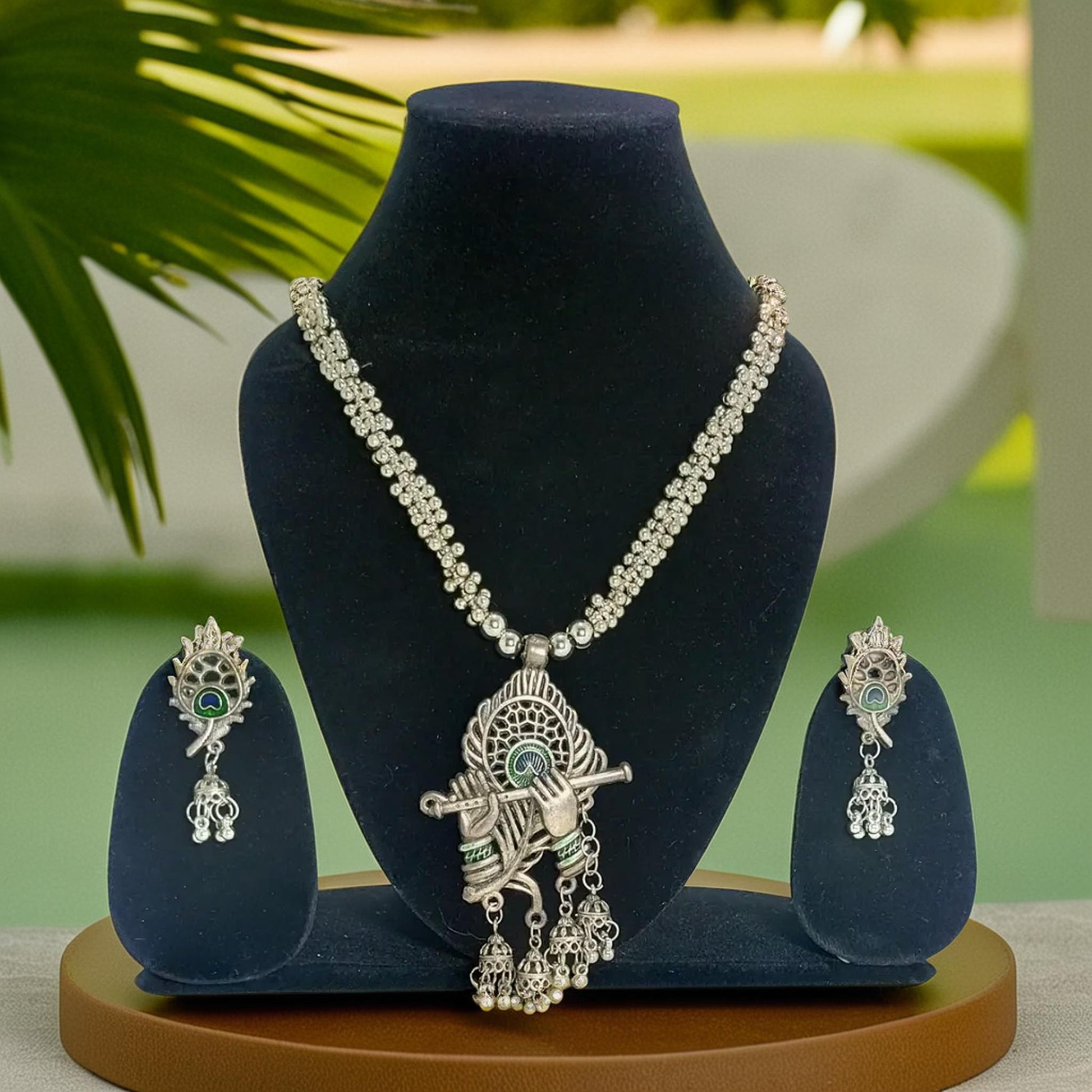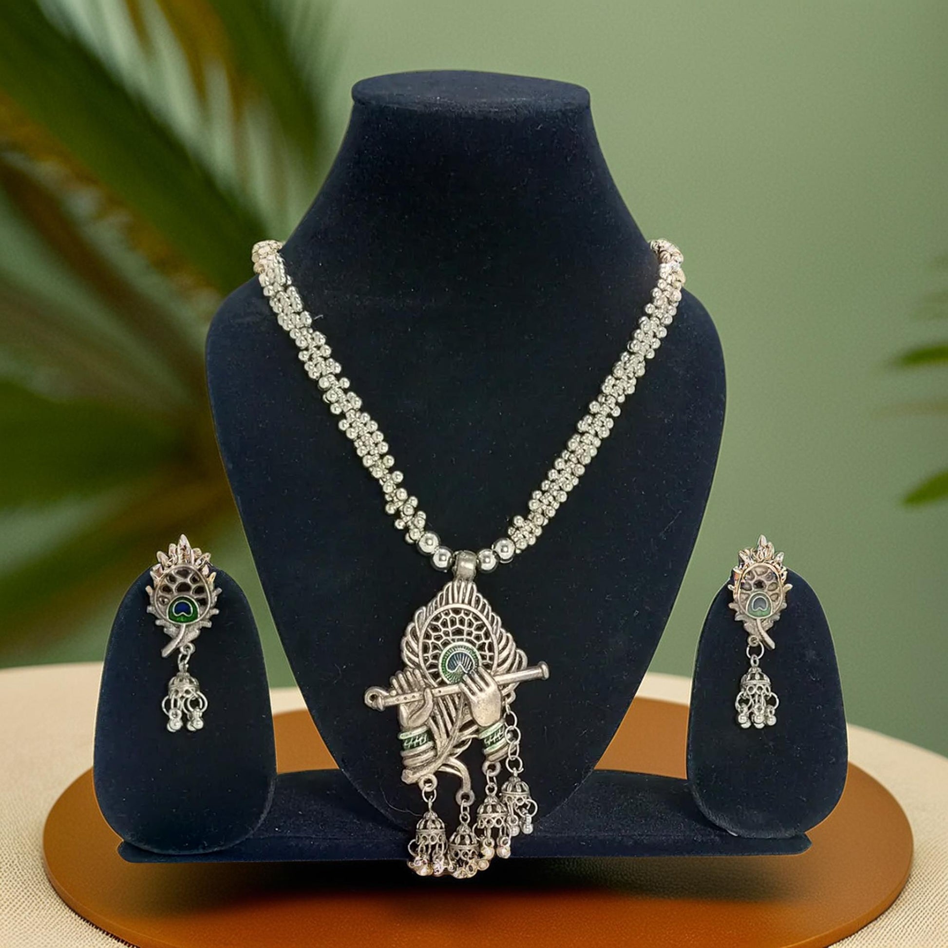Silver-coated oxidised designer Rani Haar set featuring Krishna flute & Peacock feather necklace adorned with peacock feathers with matching earrings, perfect for women and girls.