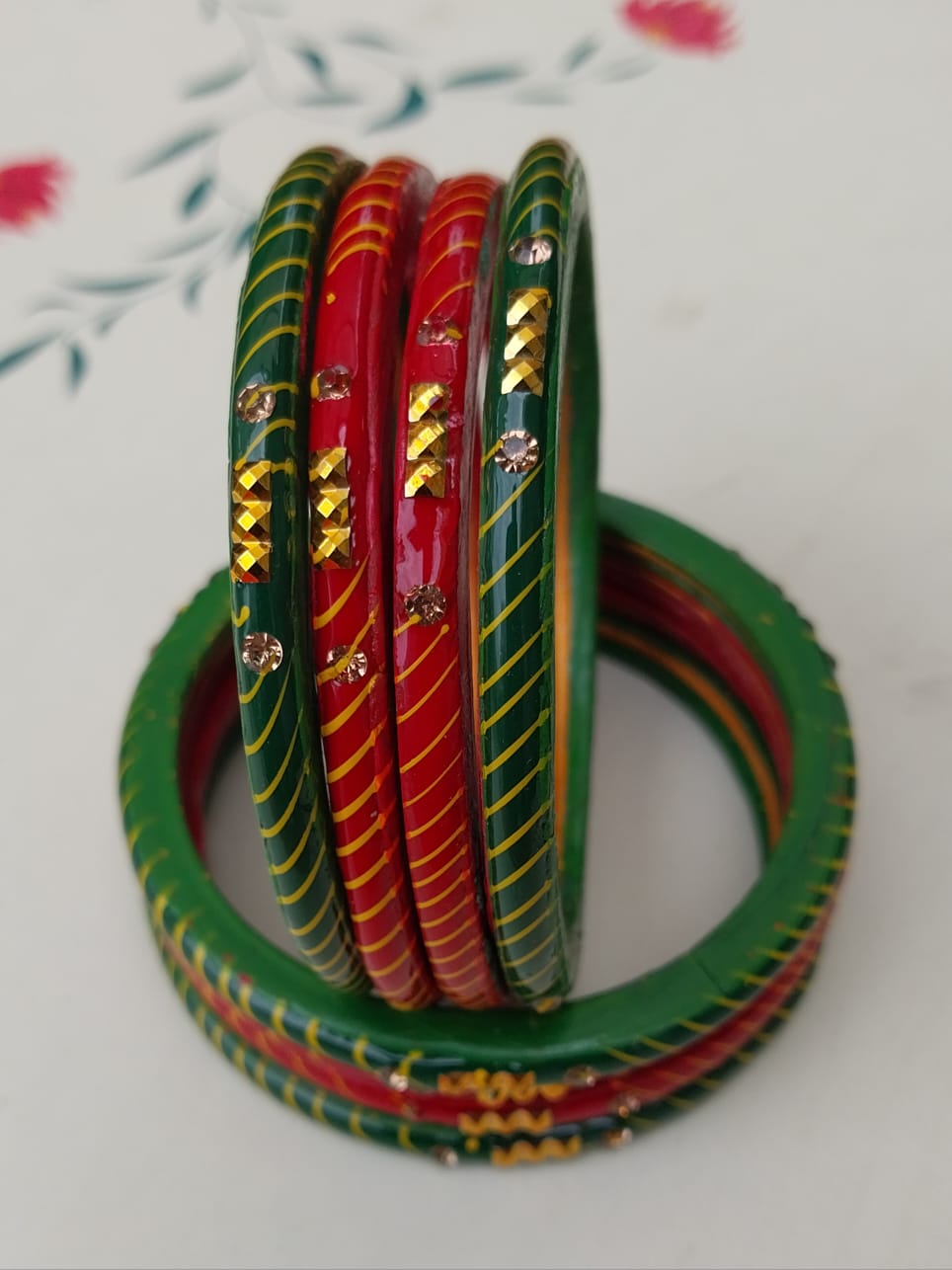 Red & Green Rajasthan Golden stone Lehariya design bangles are Handcrafted lac bangles, Set of 8. Perfect for Festivals, Traditional Functions, Weddings. Ideal for Women & Girls..