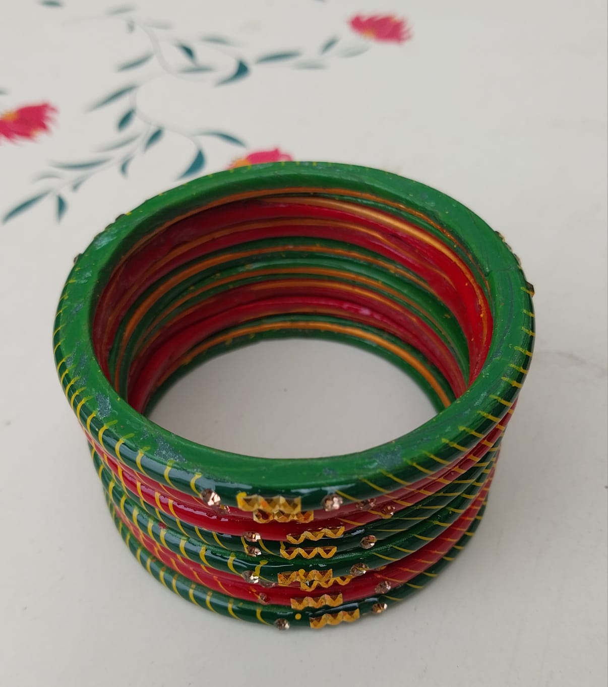 Gaon ka saman introduces artisan-crafted lac bangles from Rajasthan, India. This set features stunning red and green bangles with intricate golden detailing, packaged as 8 sets. Specifically designed for Festivals, Traditional Functions, and Weddings, these bangles embody traditional Rajasthani craftsmanship. Versatile and elegant, they complement traditional, ethnic, designer, or party attire. Perfect for Women & Girls, each bangle is a piece of art.