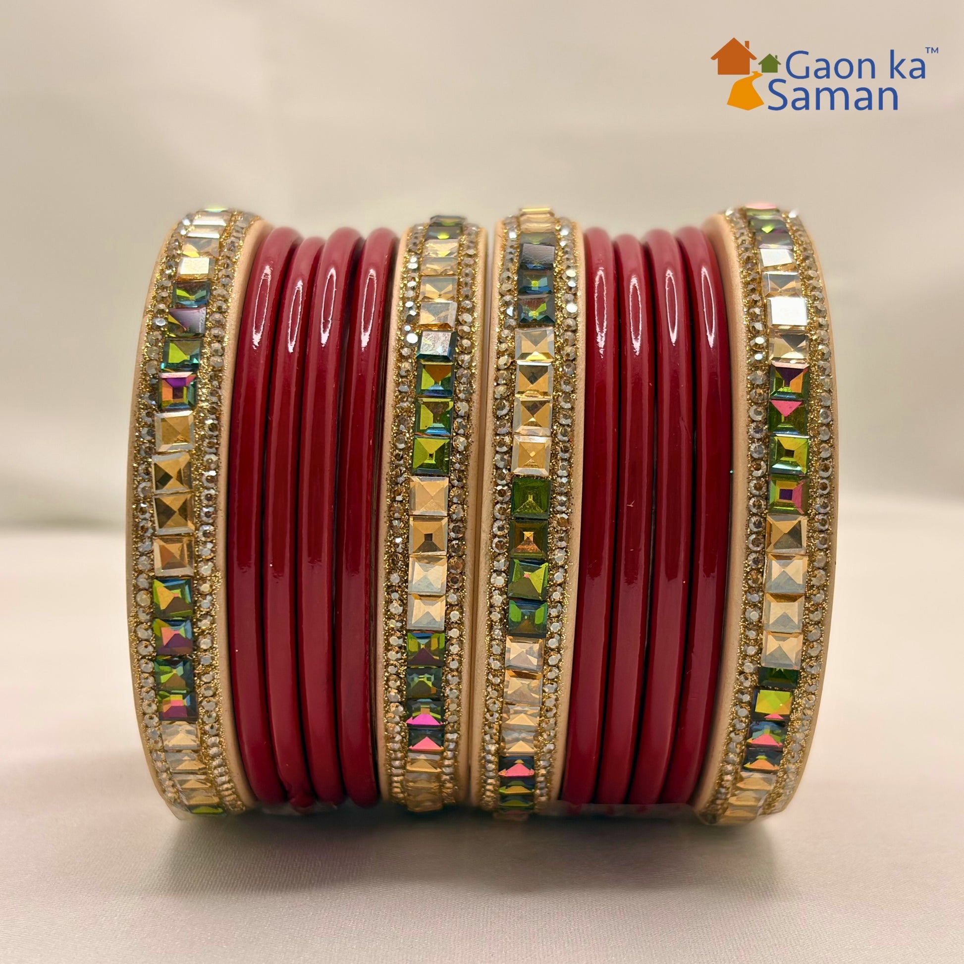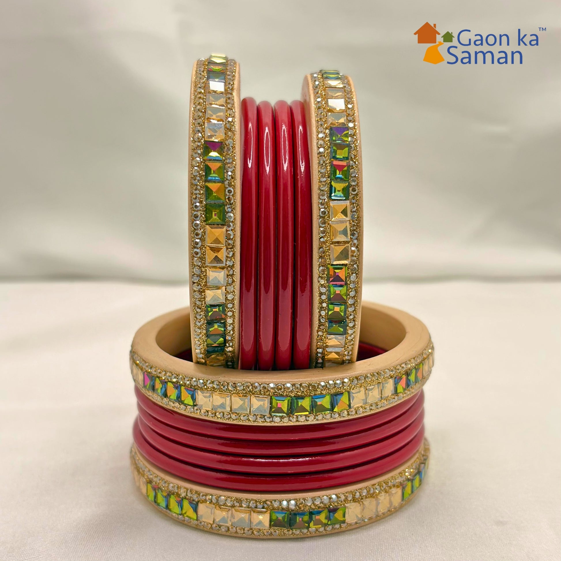 Explore our exquisite Lakh chura at Gaon ka Saman, meticulously handcrafted by Rajasthan's skilled artisans, Red & cream Colour Chura Set: Lakh bangles with outer golden bangles adorned by American diamonds. Single diamond bangles are interspersed between the Green bangles, exuding stunning elegance. adding grace to any outfit. Elevate your style by pairing it with traditional, ethnic, designer, or party attire.