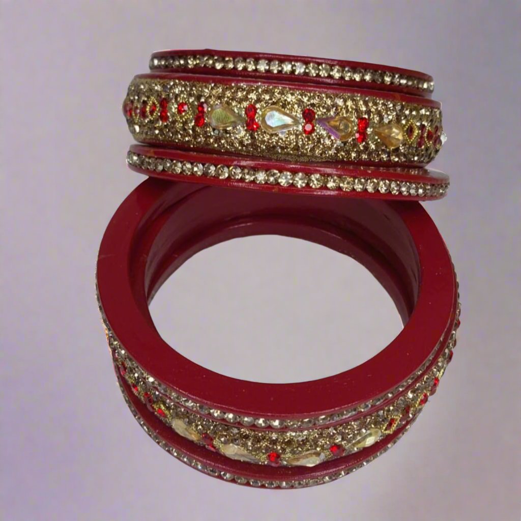 Gaon ka Saman Introducing a beautiful red lac bangle set, handcrafted by skilled artisans. These bangles feature elegant golden teardrop stones paired with red and white zircon bangles, making them a perfect blend of tradition and style. Crafted with high-quality materials, this set offers durability and timeless beauty, perfect for any special occasion .