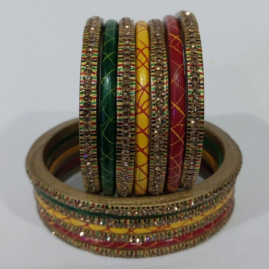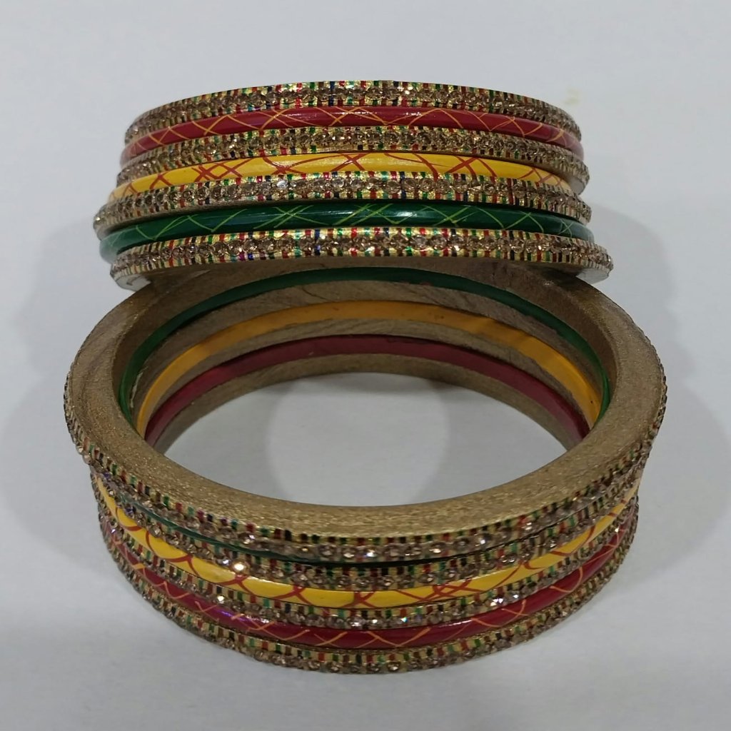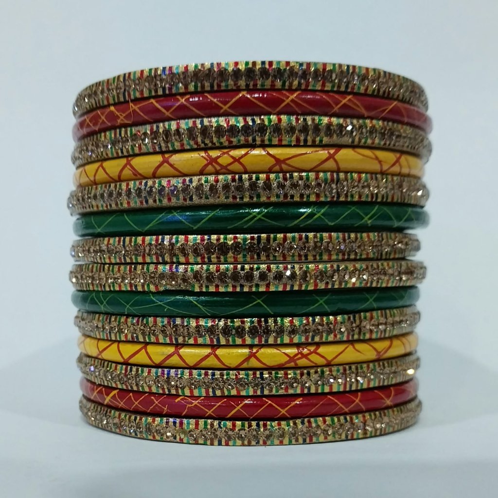Set of 14 bangles featuring a vibrant red, yellow, and green Lehariya design, paired with golden bangles accented by multicolor stones and golden circular zircon, perfect for enhancing your style during festivals, functions, and weddings.