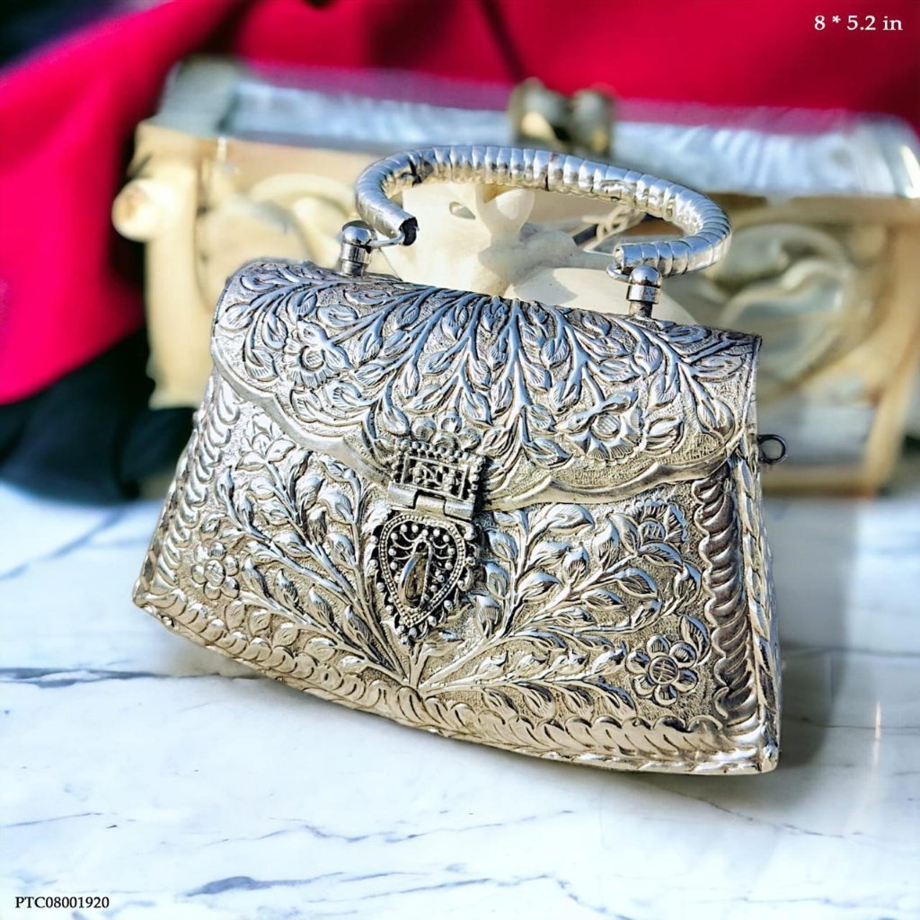 Silver-plated brass clutches with intricate designs and vibrant Meenakari work. Attached chain and handles for convenience, Perfect for adding elegance to women's attire, ideal for various occasions. Perfect for daily wear and special occasions.