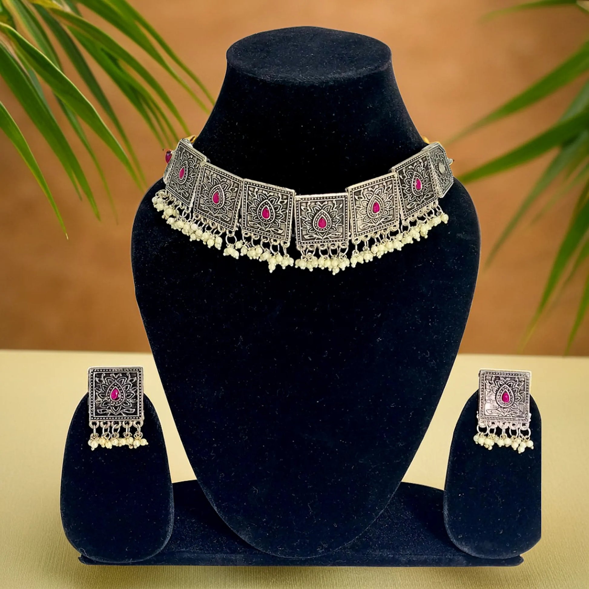 Gaon ka Saman Introducing an exquisite antique choker, handcrafted by skilled artisans with traditional craftsmanship. Featuring intricately designed square-shaped motifs, beautiful engravings, and stunning embellishments, this choker offers a regal and timeless appeal. Made from high-quality alloy, its unique detailing enhances its charm, making it an elegant addition to your jewelry collection.