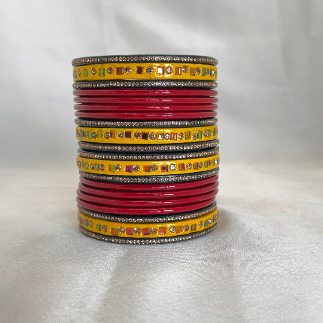 Lakh Bangle Set of 20, featuring a vibrant design with 2 yellow center bangles, surrounded by lehariya-red and green stones-studded bangles. Perfect for Women & Girls, Festivals, Traditional Functions, Wedding.