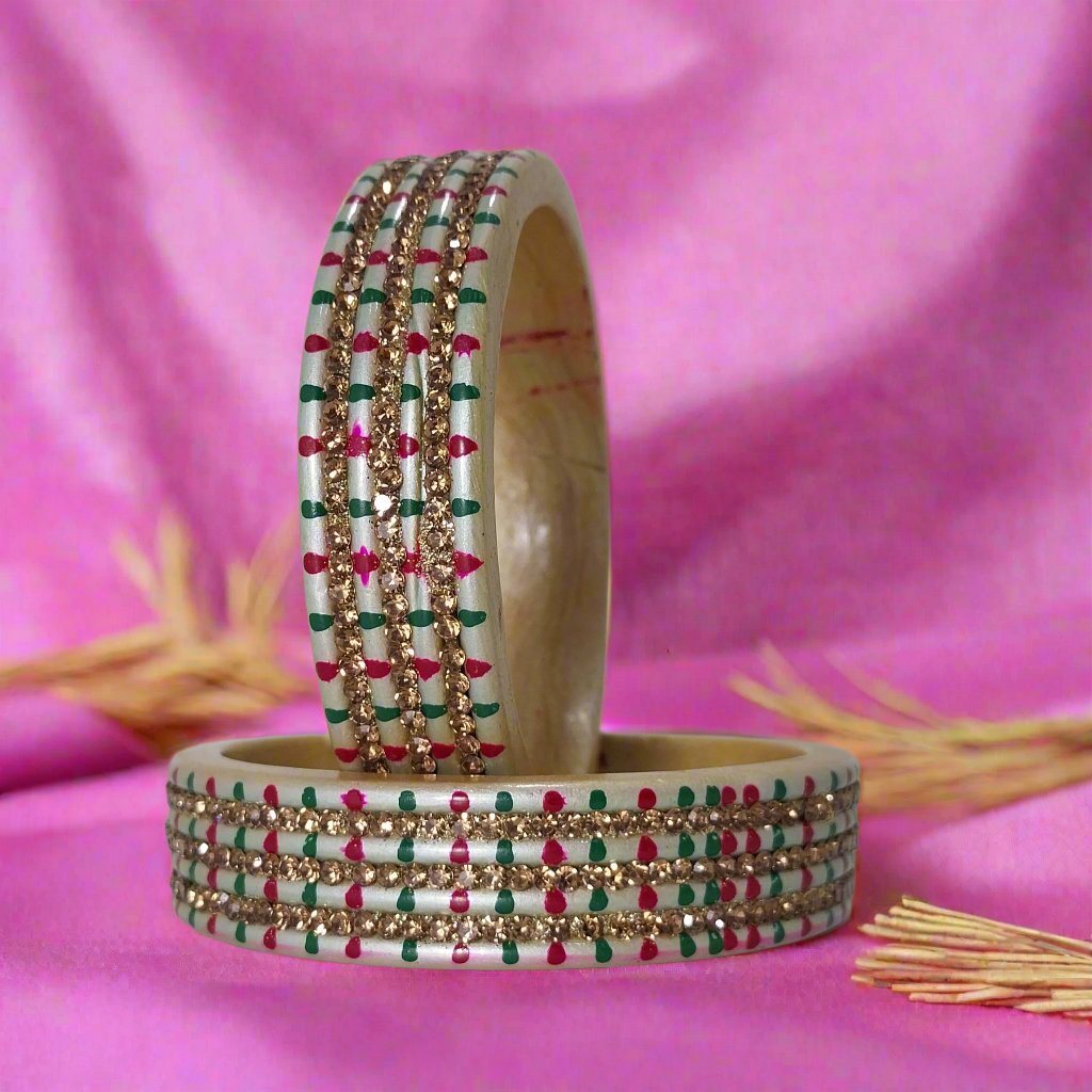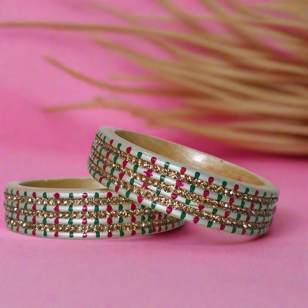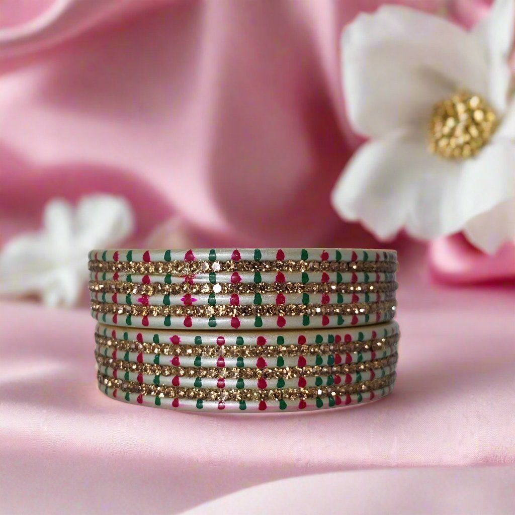 Set of 2 silver lakh kadda bangles with green, pink, and gold dots for a stacked look. Ideal for festivals, functions, parties, weddings—perfect for Girls & Women.