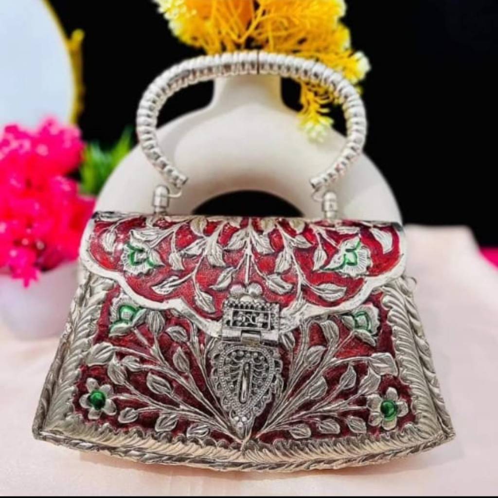 This elegant trapezium-shaped clutch from Gaon Ka Saman is crafted with silver-plated brass and adorned with intricate Meenakari work. The vibrant red base is beautifully complemented by silver and green vine detailing, creating a striking contrast. Designed with both style and practicality in mind, the clutch includes an attached chain and handle for easy carrying. Ideal for weddings, festive occasions, or daily use, this artisan-crafted clutch adds a unique touch of sophistication to any ensemble.