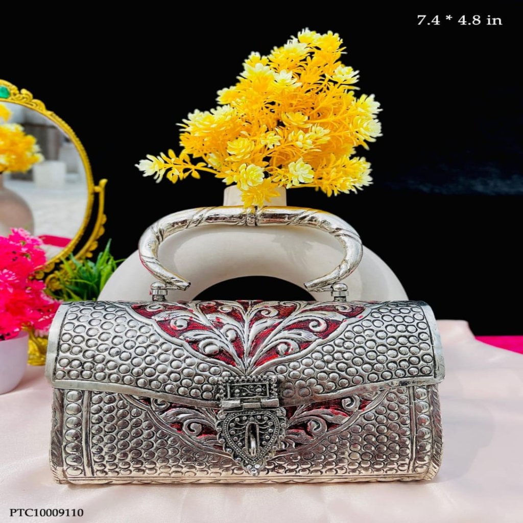 Crafted with precision, this silver-plated brass rectangle clutch from Gaon Ka Saman features intricate Meenakari work on a striking red base, beautifully enhanced by delicate silver vine detailing. Designed with both elegance and practicality, the clutch includes an attached chain and handle for effortless carrying. Ideal for both daily use and special occasions, this artisan-made piece adds a sophisticated touch to your festive, traditional, or contemporary outfits.