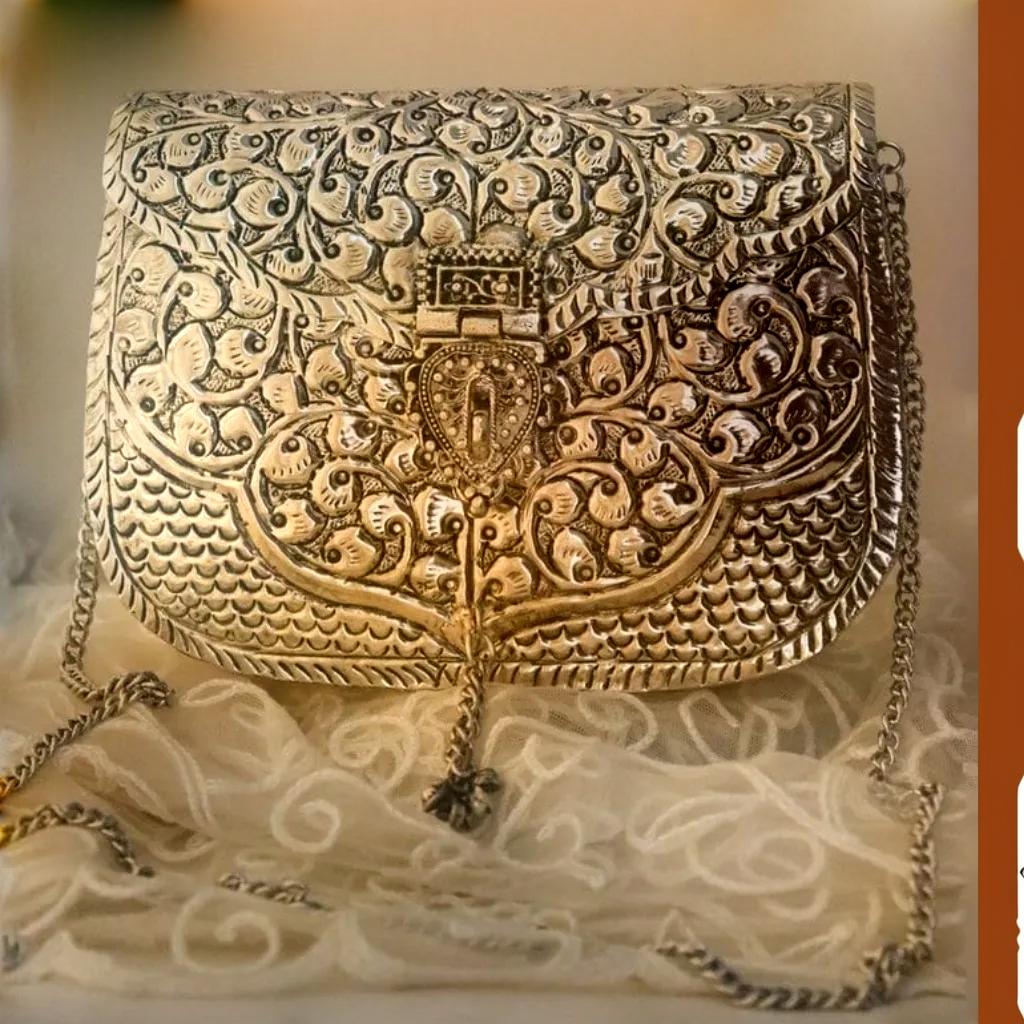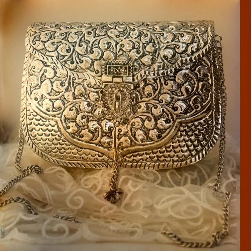 Stunning silver vintage clutch with detailed patterns and a chain strap, perfect for festivals, functions, parties, weddings—ideal for girls and women.