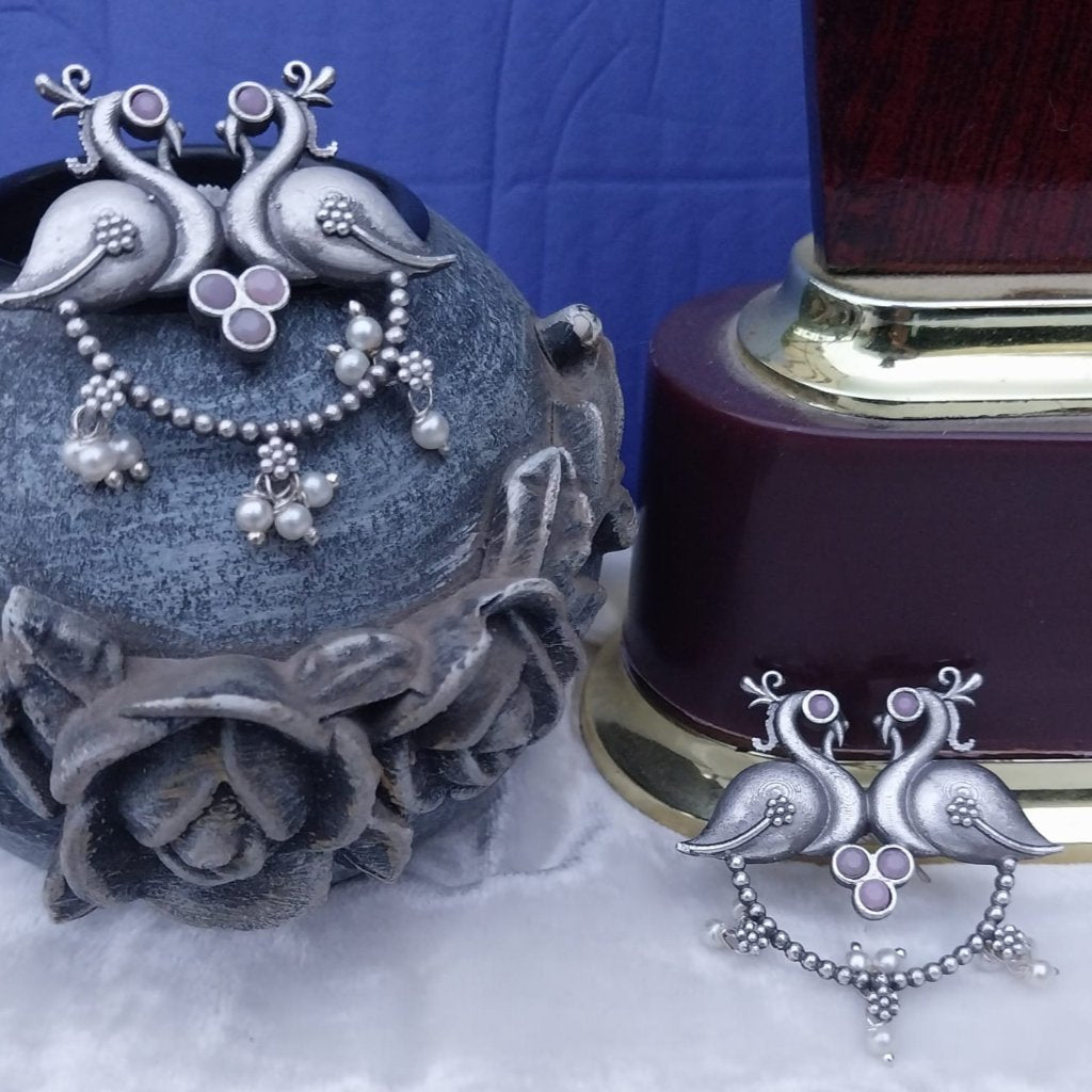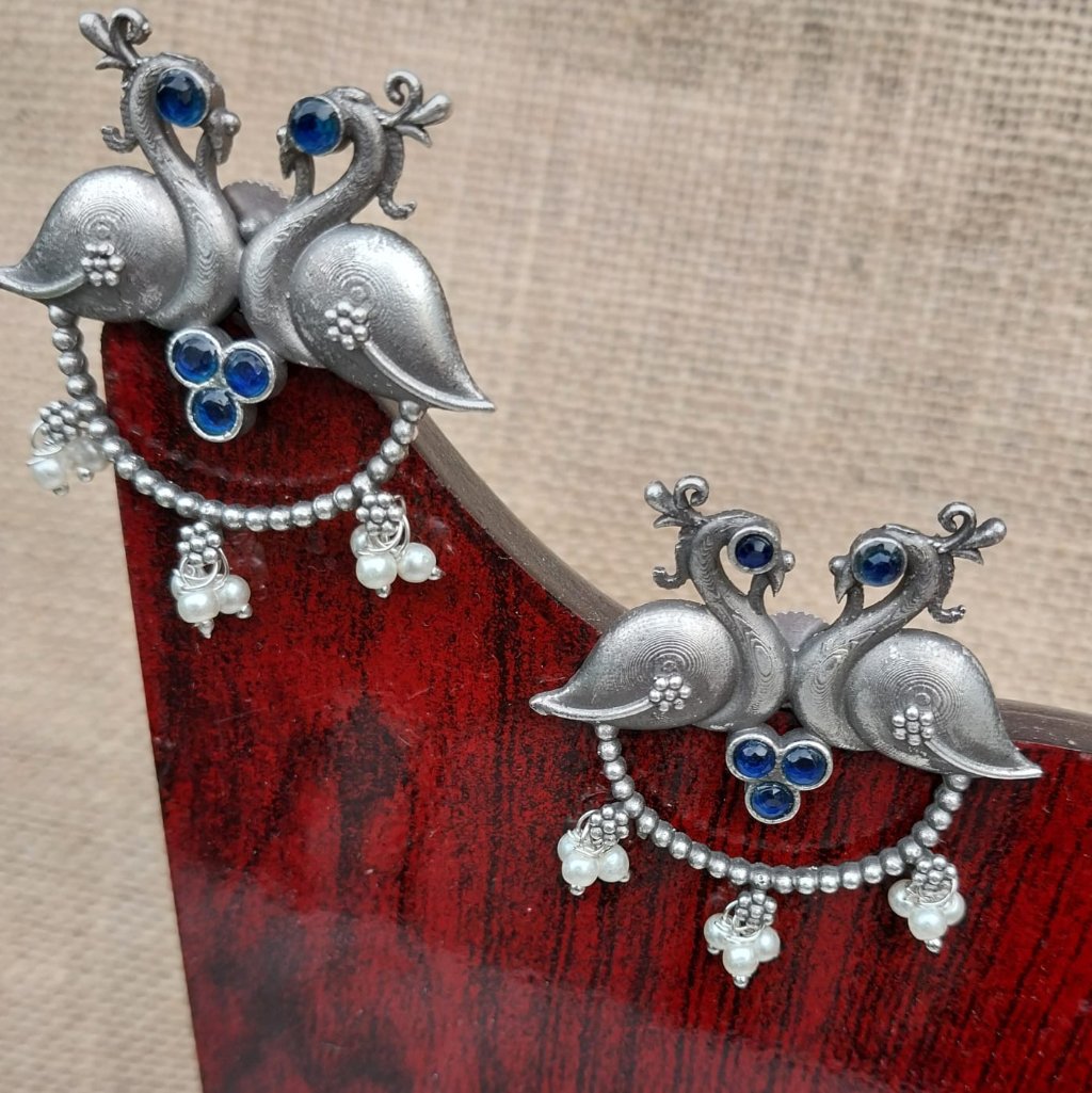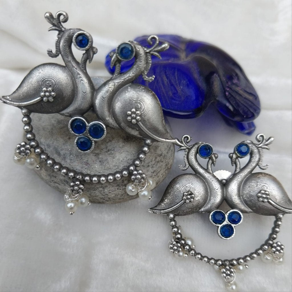 Introducing elegant swan silver oxidized earrings featuring detailed rings and dangling pearl stones, perfect for a graceful look at ease. Occasions like festivals, functions, parties, weddings perfect for girls & women.
