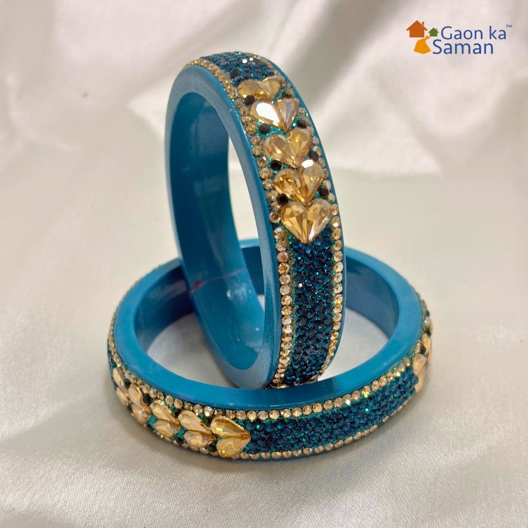 Explore our Beautiful lac bangles at Gaon ka Saman, meticulously handcrafted by Rajasthan's skilled artisans, Firozi Lakh Bangle Set of 2 bangles with golden stones and mirrors, enhanced by twin Rani & Golden stones and the twin line of golden stones for exquisite elegance. adding grace to any outfit. Elevate your style by pairing it with traditional, ethnic, designer, or party attire.