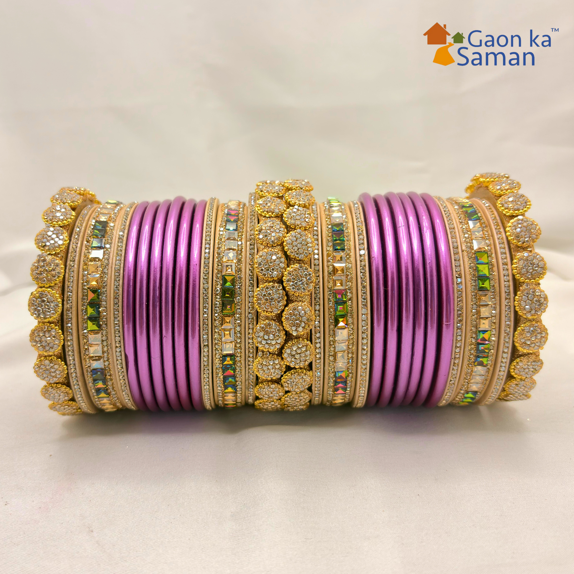 Explore our exquisite Lakh chura at Gaon ka Saman, meticulously handcrafted by Rajasthan's skilled artisans, Pyazi & cream Colour Chura Set: Lakh bangles with outer golden bangles adorned by American diamonds. Single diamond bangles are interspersed between the Green bangles, exuding stunning elegance. adding grace to any outfit. Elevate your style by pairing it with traditional, ethnic, designer, or party attire.