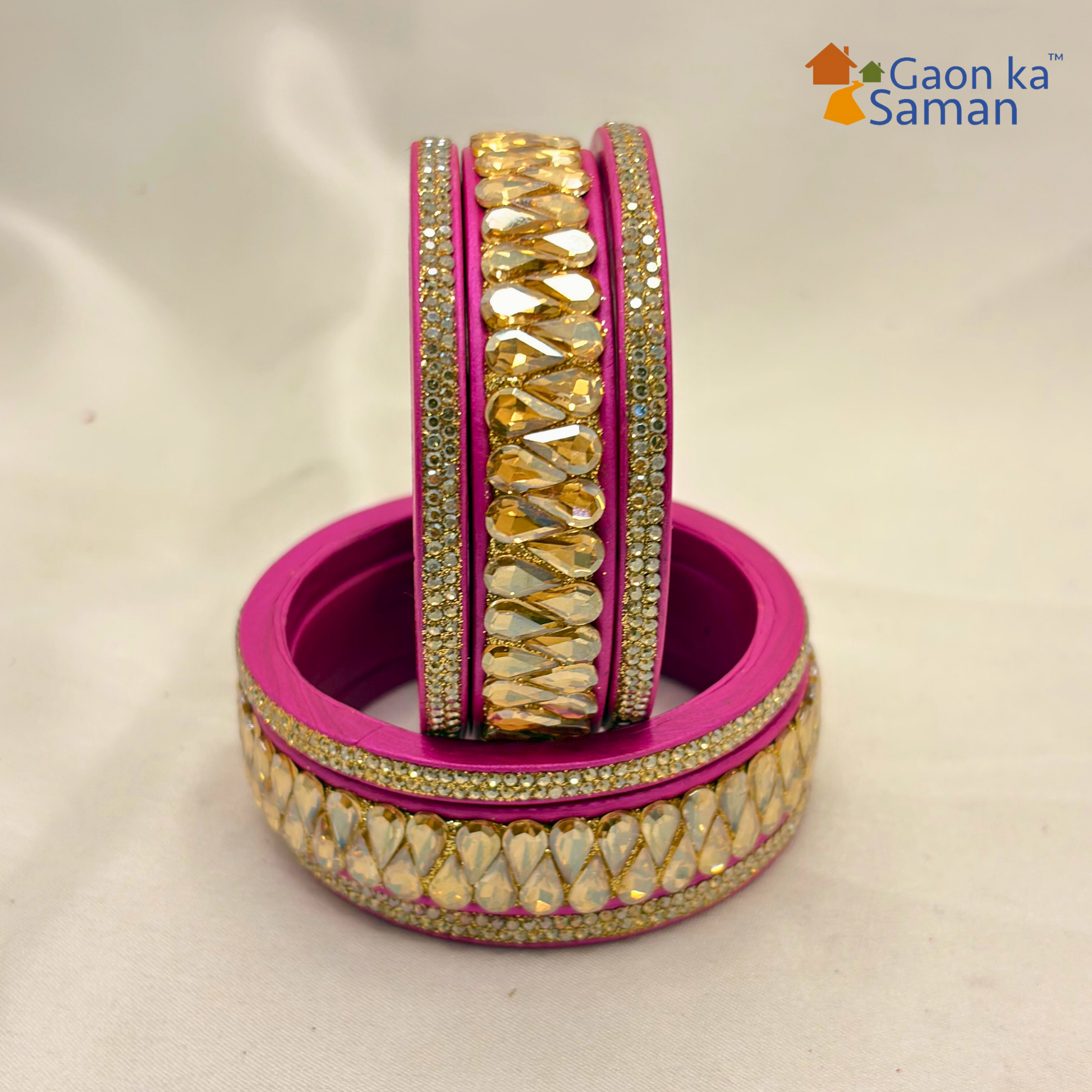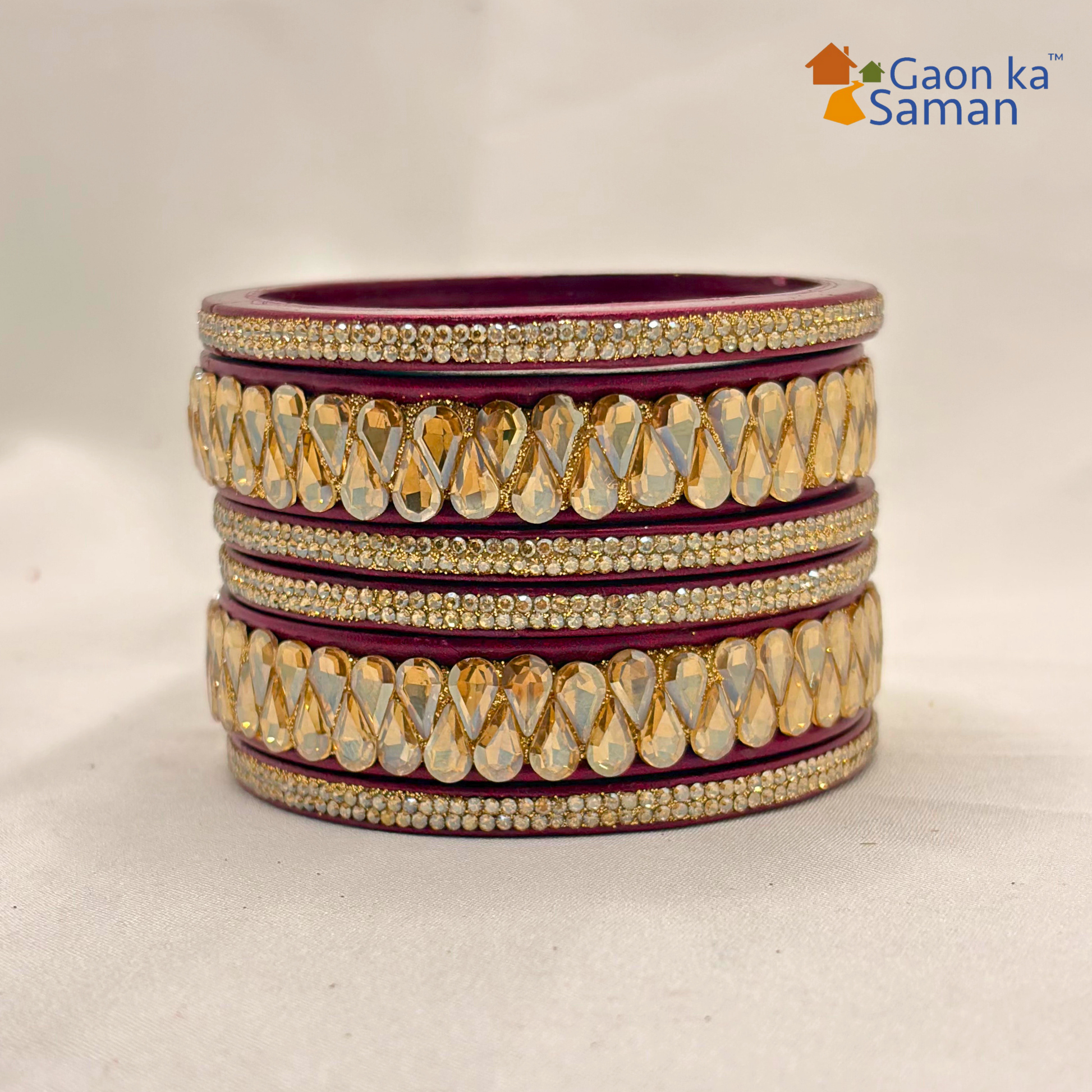 Gaon ka Saman Introducing a sophisticated maroon lac bangle set, crafted by skilled artisans. Featuring eye-shaped stones in a floral design, paired with golden crossed-shaped stones and thin gold zircon bangles, this set is made from durable materials and offers a rich, traditional appearance, ideal for special occasions .
