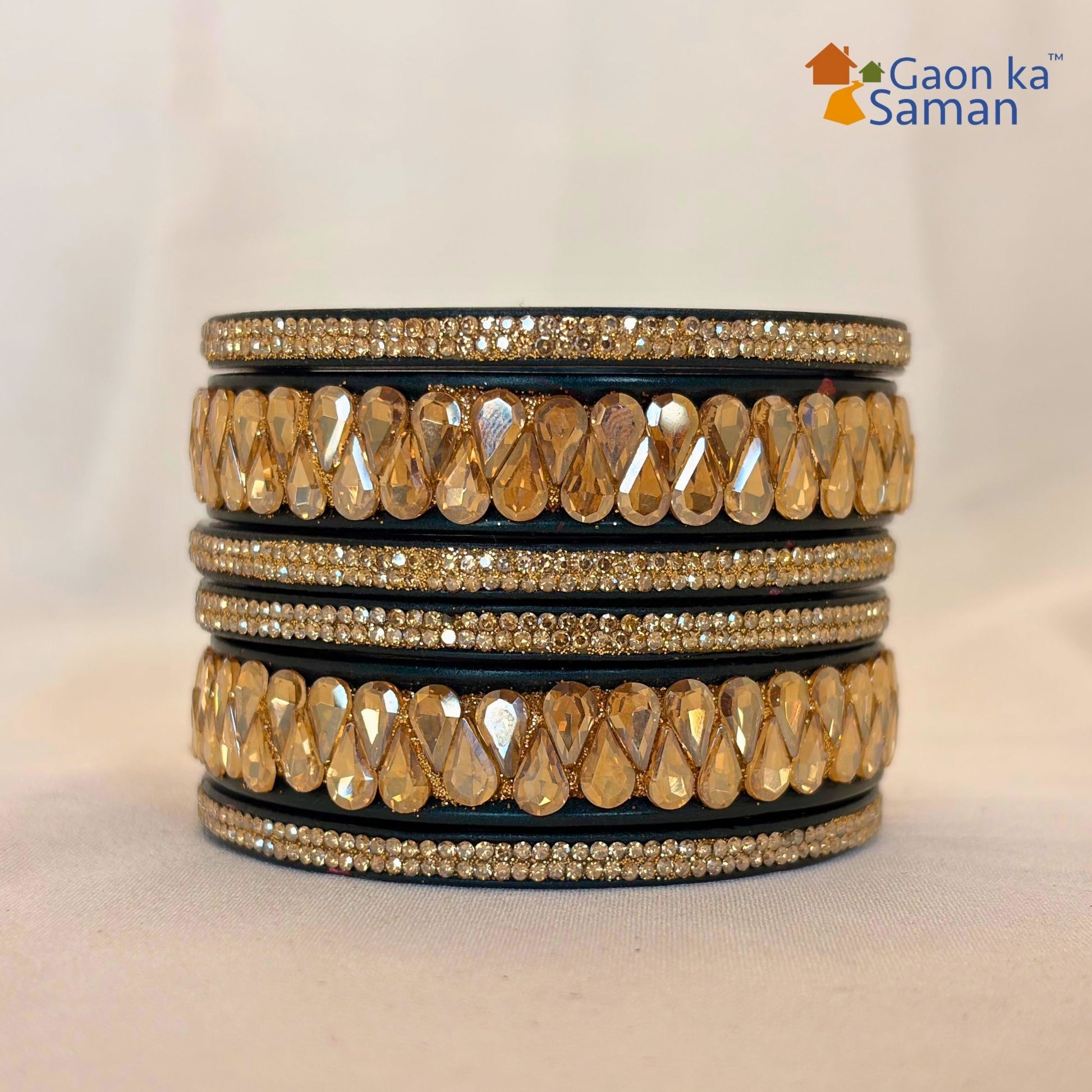 Introducing lac bangles with eye-shaped stones and golden cross designs, crafted for a timeless look at ease. Occasions like festivals, functions, parties, weddings perfect for girls & women.