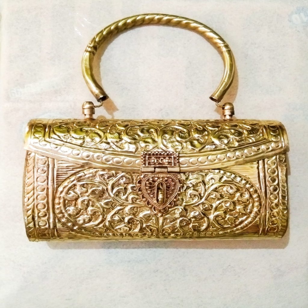 Presenting 'Vine Designed Clutch' - Gold-plated brass clutches adorned with detailed designs and vibrant Meenakari work. These elegant clutches feature attached chains and handles for convenience. Ideal for adding a touch of sophistication to women's attire at weddings, parties, and special gatherings.
